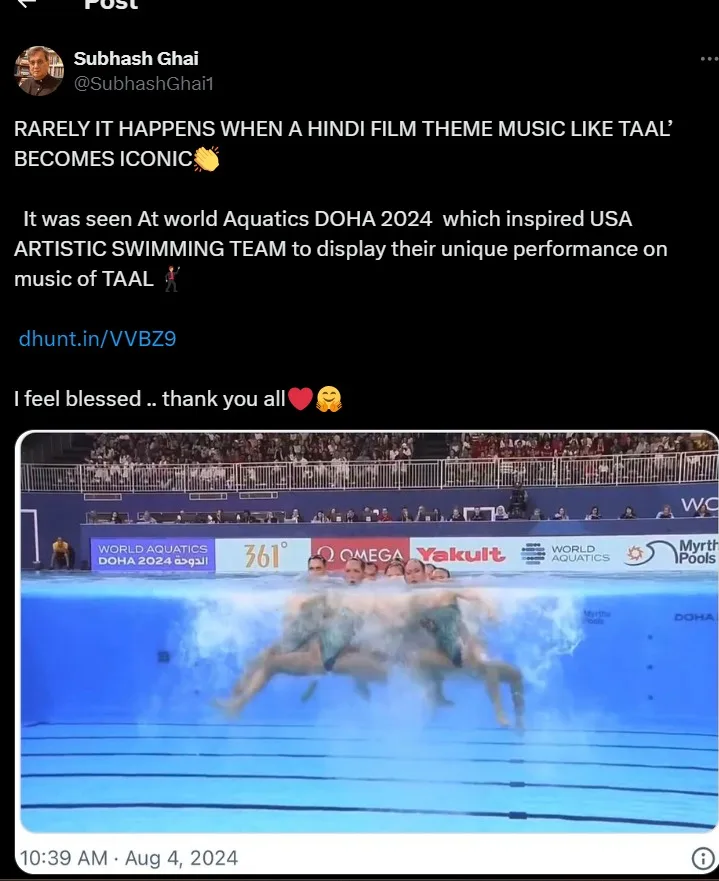 “RARELY IT HAPPENS WHEN A HINDI FILM THEME MUSIC LIKE TAAL BECOMES ICONIC. It was seen at World Aquatics DOHA 2024 which inspired the USA ARTISTIC SWIMMING TEAM to display their unique performance on the music of TAAL. I feel blessed… thank you all.”
