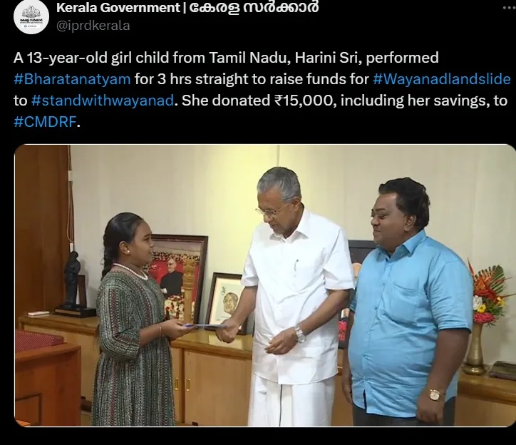 “A 13-year-old girl child from Tamil Nadu, Harini Sri, performed Bharatanatyam for 3 hours straight to raise funds for the Wayanad landslide to #standwithwayanad. She donated Rs 15,000, including her savings, to CMDRF.”