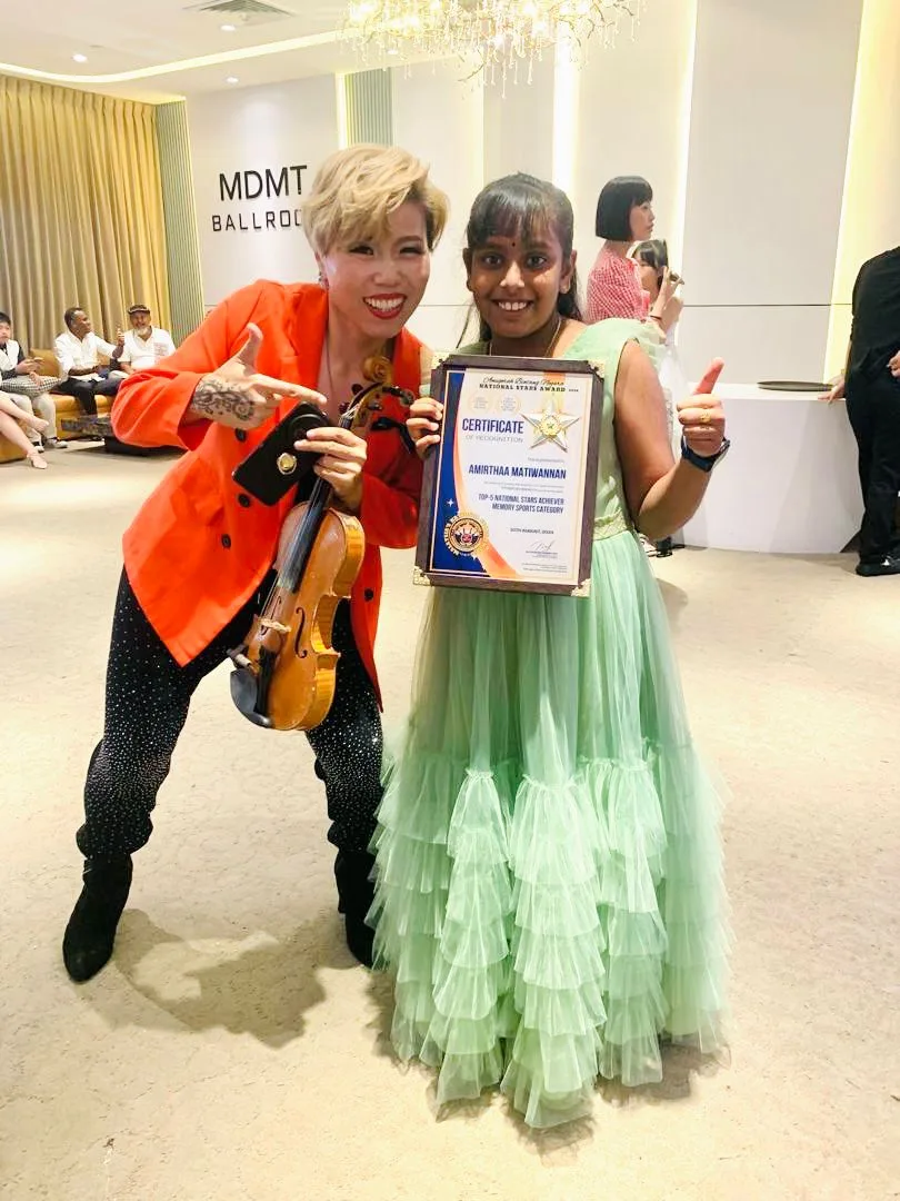 The National Star Award was presented to Amirthaa by Jessica Loo, a distinguished figure who has won numerous awards both locally and internationally. Jessica Loo is a trailblazer in the music industry, known for her groundbreaking achievements, including setting a Malaysia Book of Records title as the first person to play the violin while paragliding. Receiving an award from such a talented and innovative individual was undoubtedly an inspiring moment for Amirthaa, adding to the significance of her accomplishment. The award ceremony was held at the MDMT Ballroom in Kuala Lumpur, making it a memorable occasion for all in attendance.