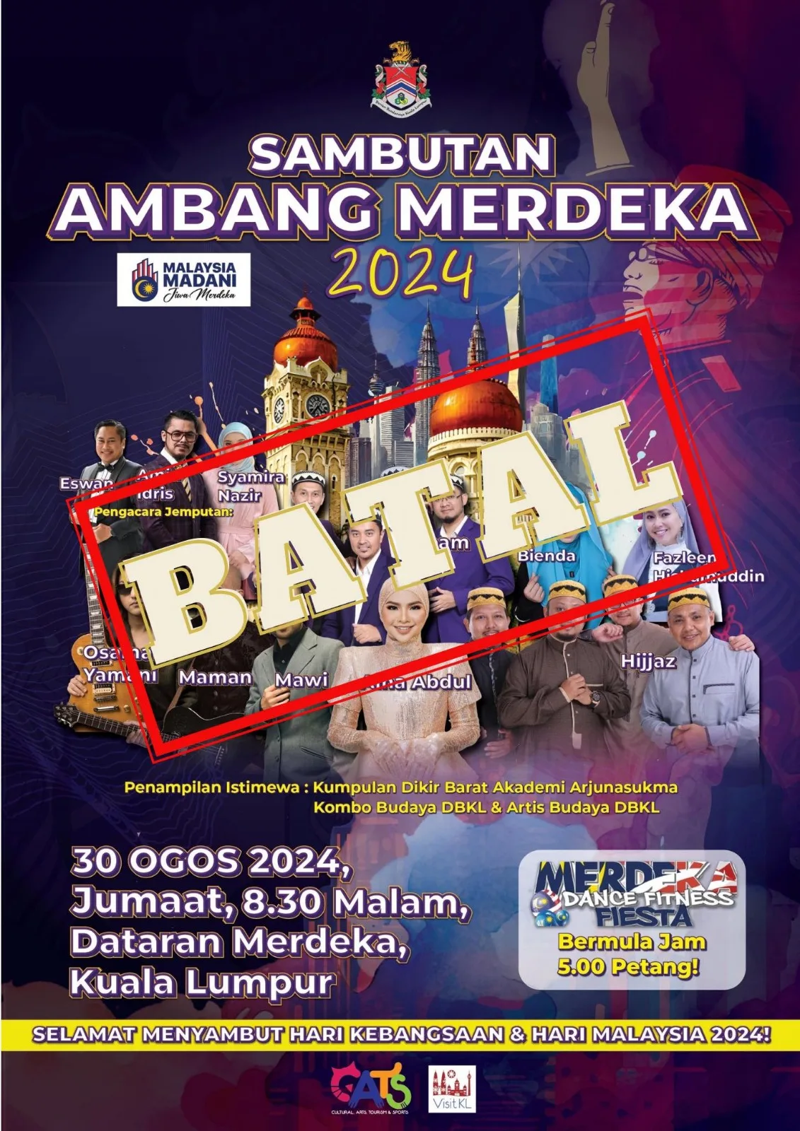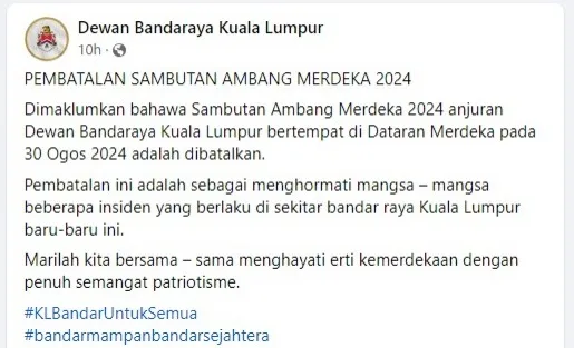 The Merdeka Eve celebration, originally planned by Kuala Lumpur City Hall (DBKL) to be held at Dataran Merdeka on Friday, has been cancelled. In an announcement on its Facebook page, DBKL stated that the decision was made out of respect for the victims of the recent sinkhole incident and other unfortunate events that have occurred in the city lately.
