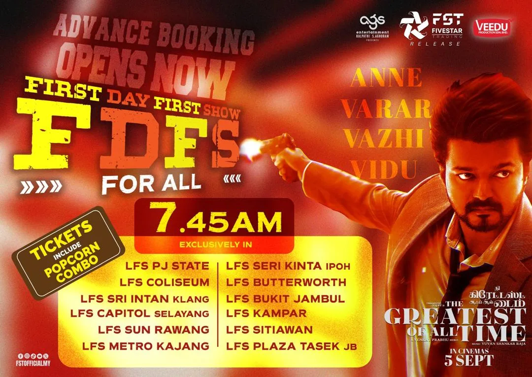 Five Star Trading will be hosting a First Day First Show for ‘The GOAT’ at 12 LFS Cinemas nationwide on September 5th, starting as early as 7.45am. Get ready for an unforgettable Thalapathy treat! This is literally going to be an epic Thalapathy Thiruvizha!