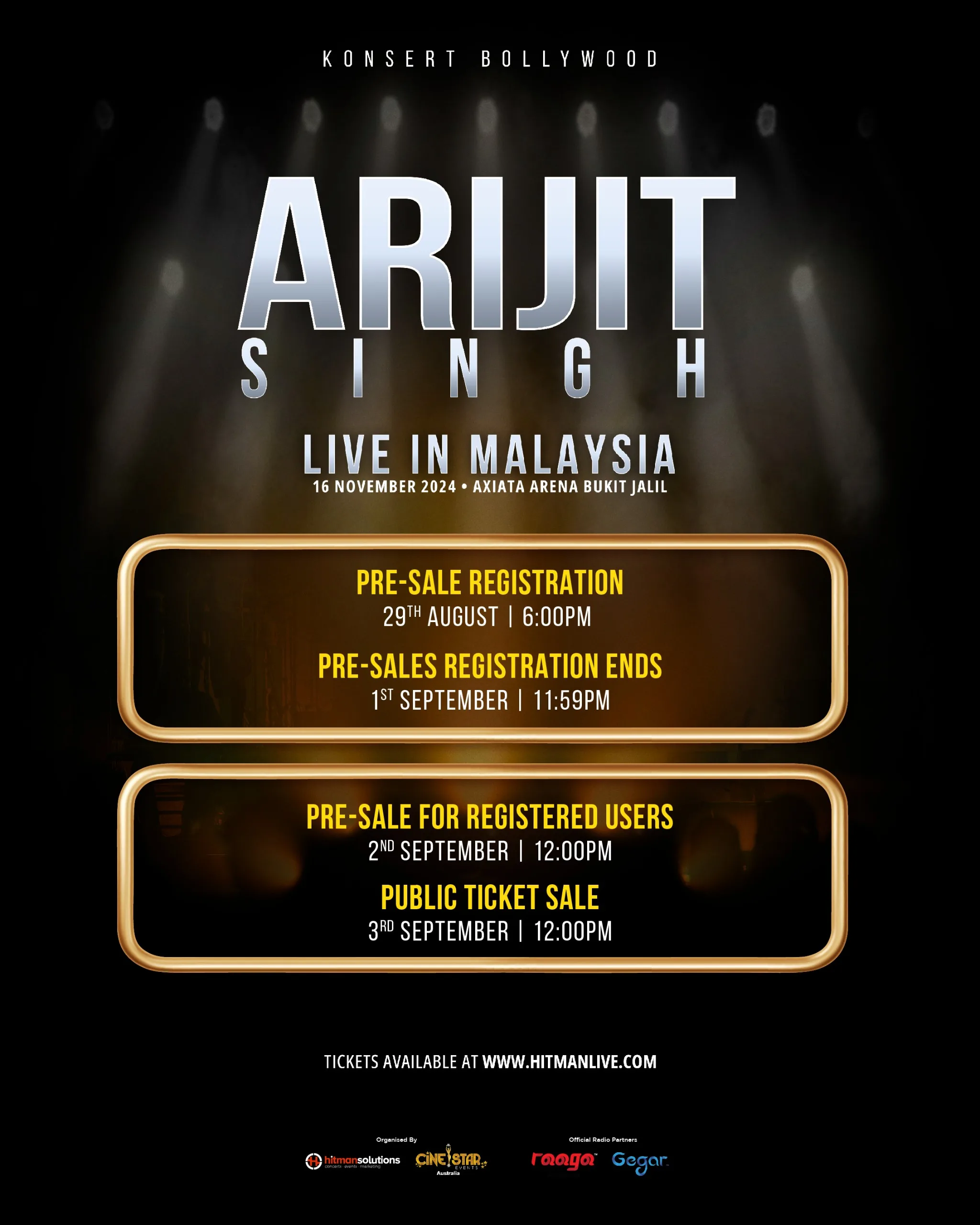 Rohit shared his excitement: “We hope all of Arijit Singh’s fans are ready to fill every corner of the Axiata Arena to experience this phenomenal Bollywood artist in action. With his newest collection of songs and a large venue, we promise an enchanting performance and a truly extraordinary experience!”