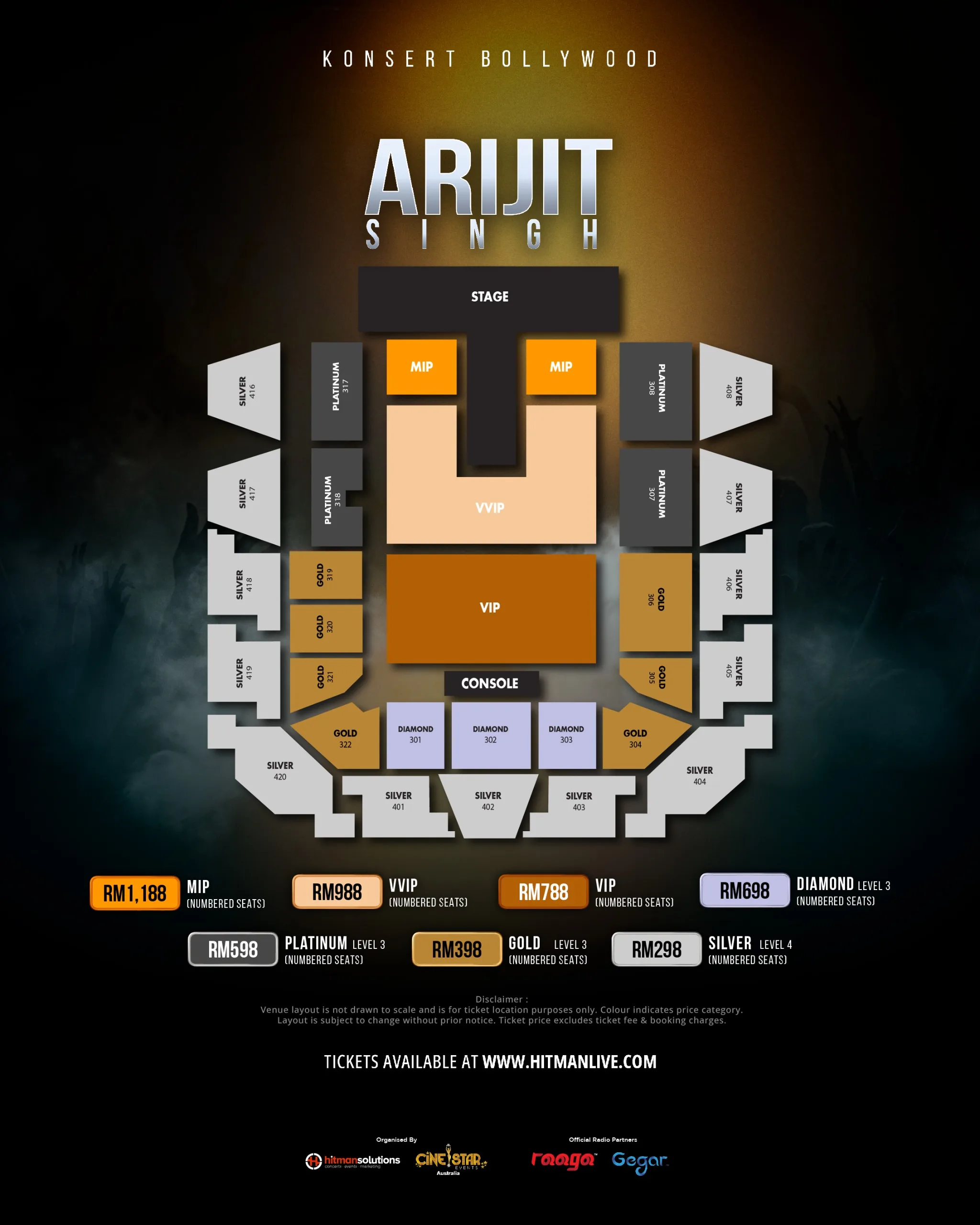 Pre-sale tickets for Arijit Singh Live In Malaysia will be available starting 2 September 2024, Monday at 12pm. General ticket sales will open the following day, 3 September 2024, Tuesday at 12pm on www.hitmanlive.com. Ticket organisers include: Silver (RM298), Gold (RM398), Platinum (RM598), Diamond (RM698), VIP (RM788), VVIP (RM988) and MIP (RM1,188).