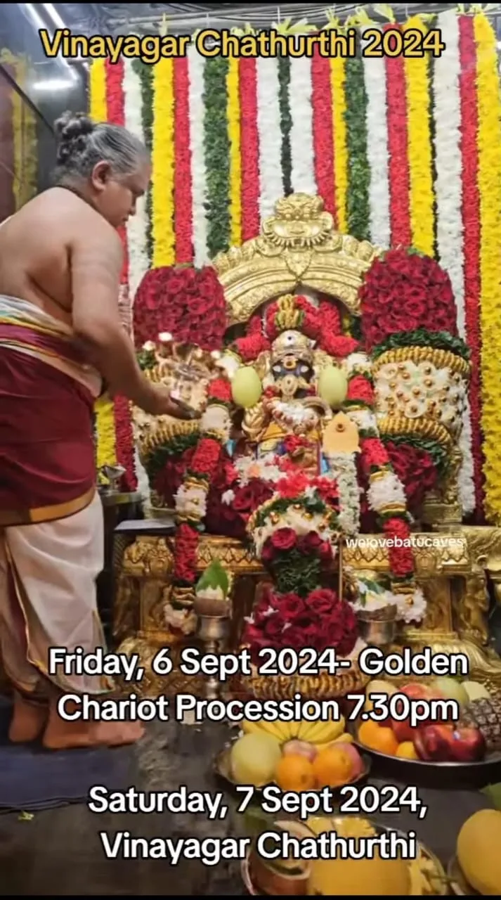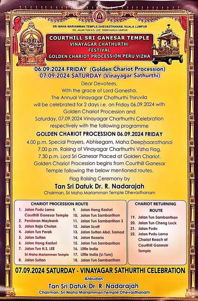 Special prayers will be held at the temple today at 4pm, followed by the flag-raising ceremony (Kodiyetram) to mark the beginning of the festival. Following that, at 7.30pm, the chariot procession will commence. Lord Ganesha will journey through Kuala Lumpur on his Golden Chariot, blessing devotees along the way.