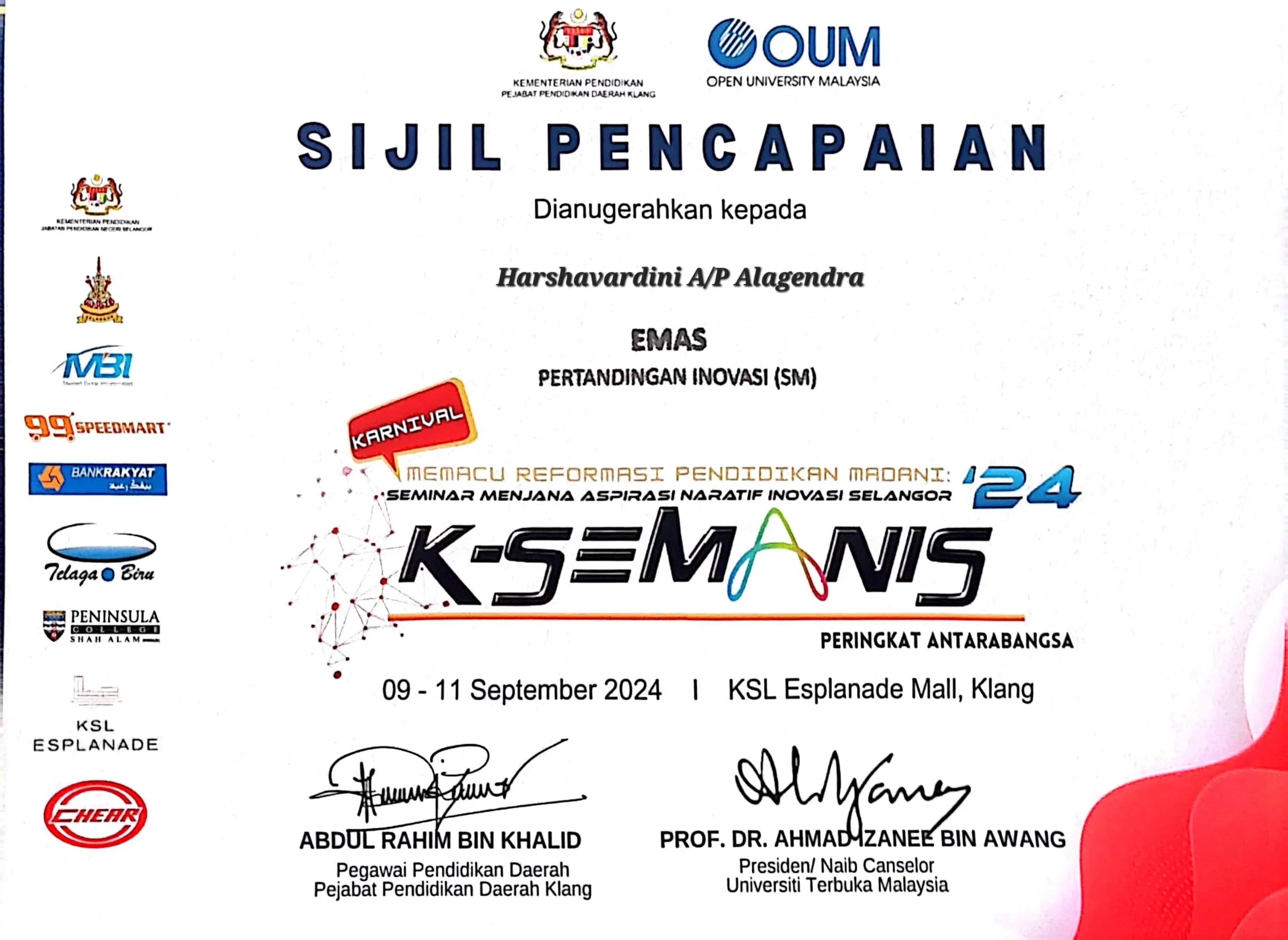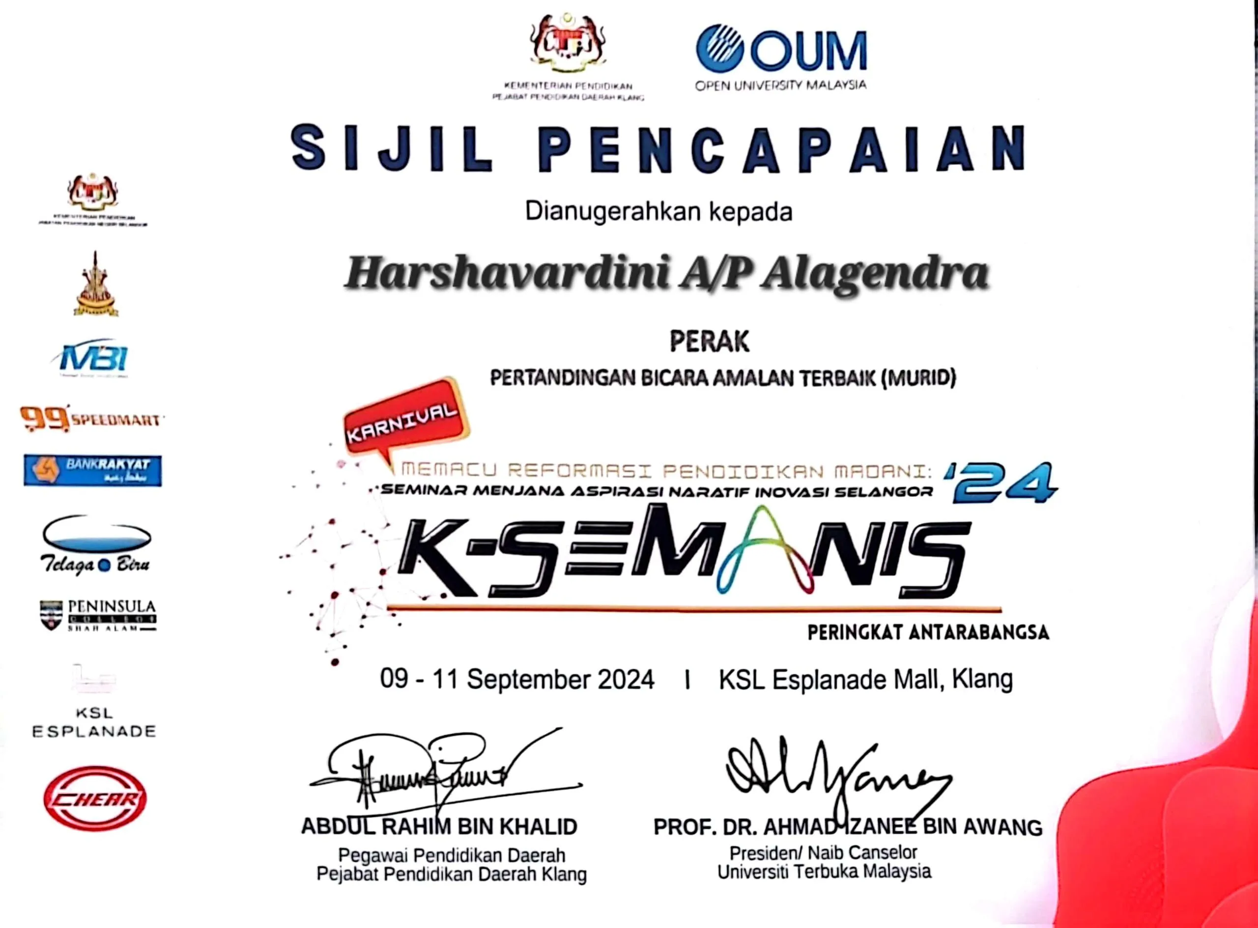 Harshavardini’s success at the K-Semanis 2024 International Innovation Competition, showcases her exceptional versatility and leadership. Supported by her dedicated teammates, mentors, and school teachers, her achievements reflect the outstanding talent and commitment to innovation and excellence at SMK Raja Mahadi. As Harshavardini continues to make her mark in various fields, her accomplishments serve as an inspiration to her peers and a source of pride for the entire community.