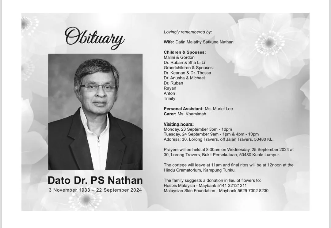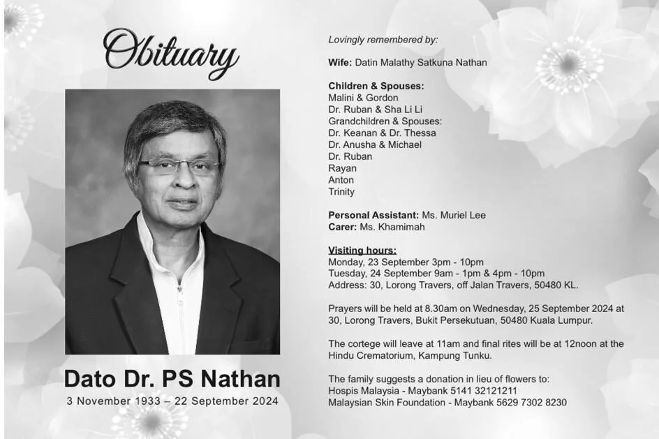 Dr. PS Nathan was a dermatologist by profession and served as president of The Dermatological Society of Malaysia from 1984 to 1986. Since 2010, he also held the position of Chairman of the Medical & Dental Advisory Committee at Assunta Hospital. In addition, Dr. Nathan ran his own clinic, ‘Nathan’s Skin, Hair & Laser Centre,’ in Bangsar, alongside his son, Dr. Ruban Nathan. The clinic is well-established and highly regarded in the Bangsar area for its quality care and expertise.