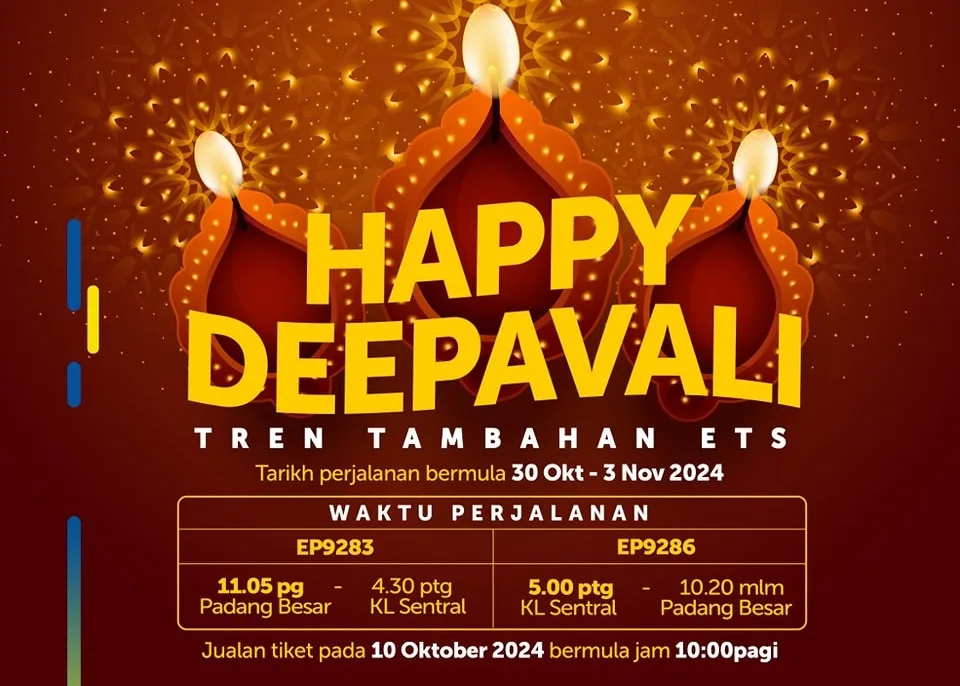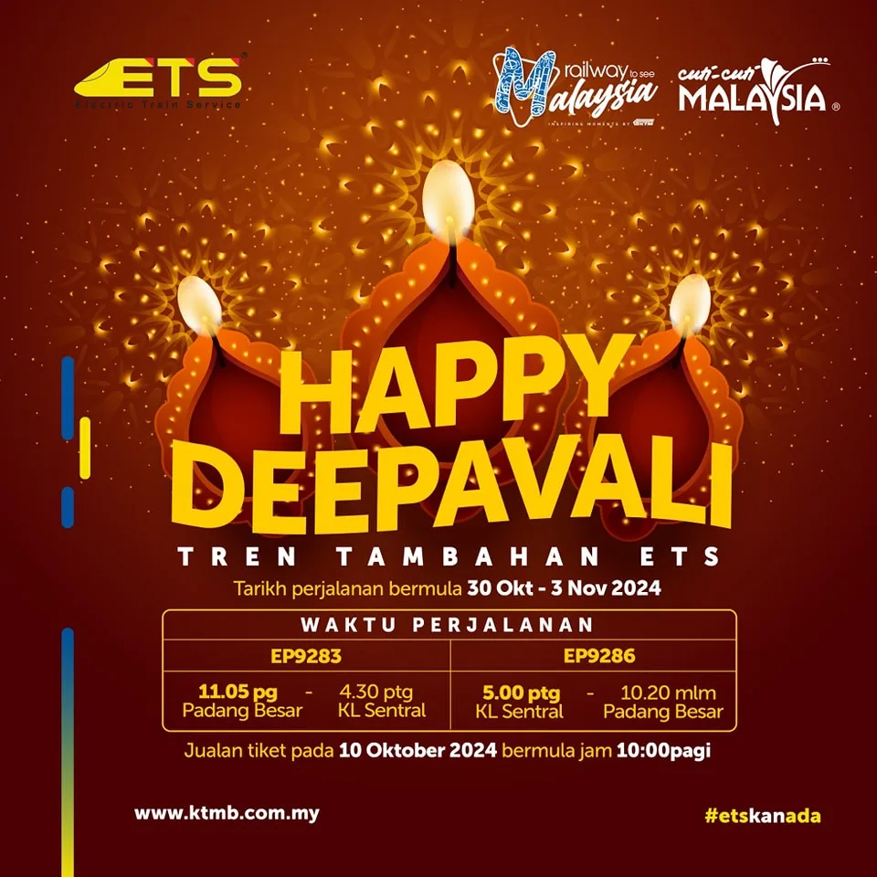 Keretapi Tanah Melayu Berhad (KTMB) provides two additional Electric Train Services (ETS) for the KL Sentral to Padang Besar route, along with return trips, to accommodate travelers during the Deepavali celebrations.