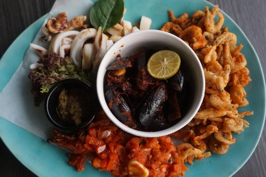 For sharing, they recommended their Seafood Platter which consisted of prawns in garlic tomato salsa, grilled calamari, mussel sambal and crispy baby shrimp. For us, the highlight of this dish was Knowhere’s sambal belacan that came with it. Spectacular.