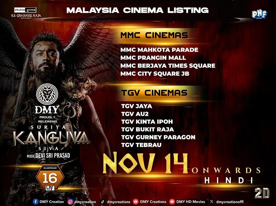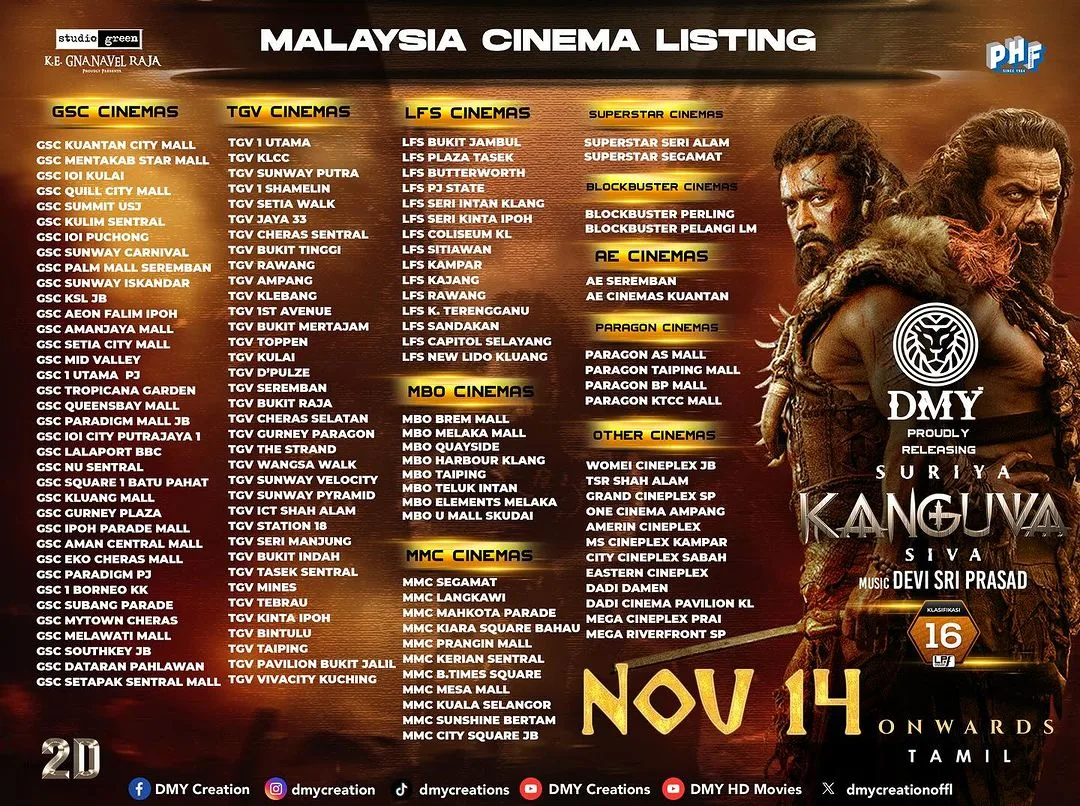 Fans are eagerly counting down the hours to finally watch ‘Kanguva’ in theaters and see Suriya return to the big screen after a significant hiatus. Ticket bookings are already open, and anticipation is at an all-time high. Additionally, DMY Creation is set to bring a 3D version of ‘Kanguva’ to audiences in Malaysia, with more updates on this release expected soon. First-day, first-show screenings are available at select LFS cinemas.