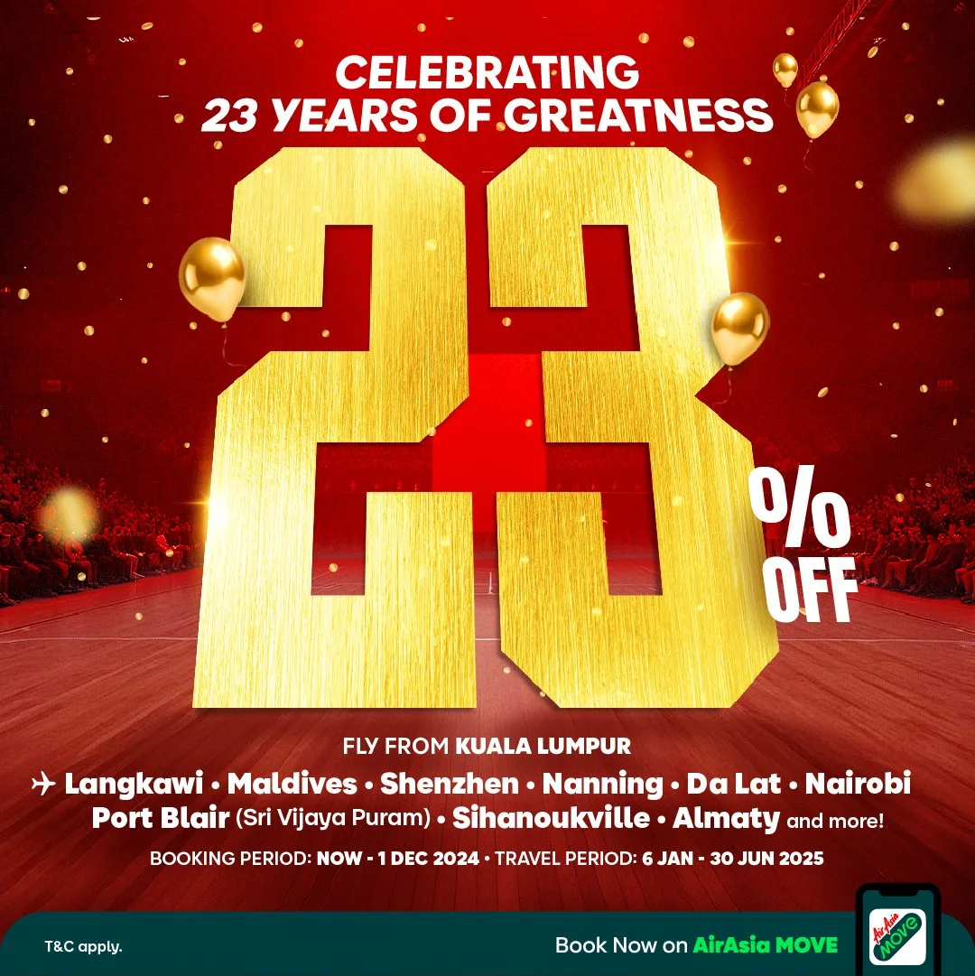 AirAsia is celebrating its 23rd anniversary by offering a special promotion of a 23% discount on flights to over 130 destinations worldwide. This exciting offer allows travelers to explore AirAsia’s expansive network, which covers various regions, all at a discounted rate.