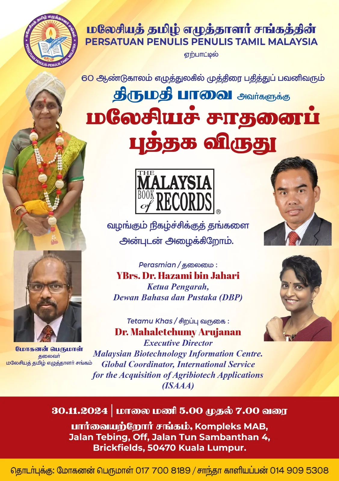 The award ceremony is scheduled to take place on November 30, 2024, from 5pm to 7pm at the Complex Blind Association Hall in Brickfields, Kuala Lumpur. The event will be officiated by Dr. Hazami Jahari, Director-General of Dewan Bahasa dan Pustaka. Additionally, Dr. Mahaletchumy Arjunan, Executive Director of the Malaysian Biotechnology Information Centre, will grace the occasion as a special guest.