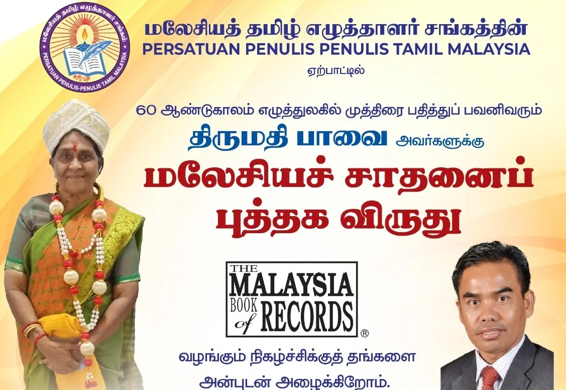 Malaysian Indians continue to excel across various fields, earning well-deserved recognition for their remarkable achievements. Among these inspiring individuals is madam Pusphaleelawathi, known by her pen name Paavai, a dedicated member of the Malaysia Tamil Writers Association (Malaysia Tamil Ezhuthaalar Sangam). She is poised to make history by securing a place in the prestigious Malaysia Book of Records.