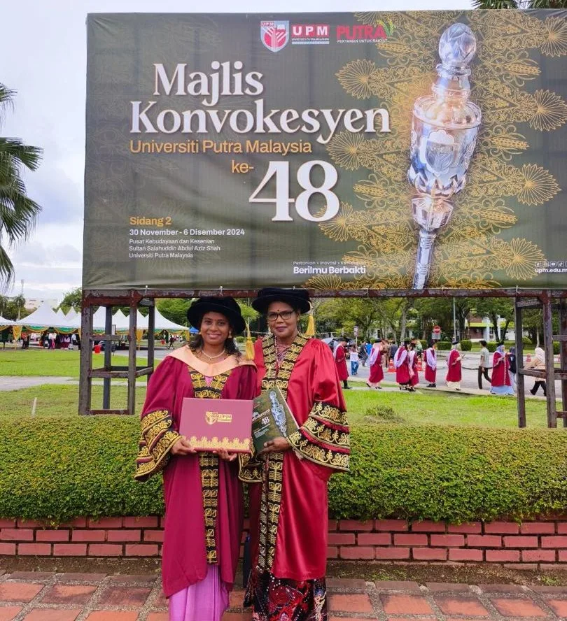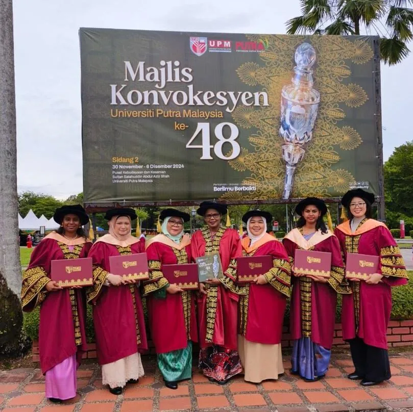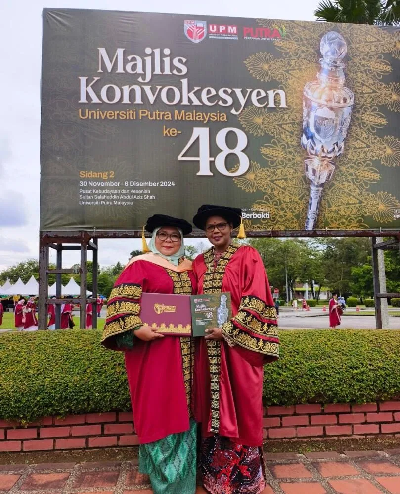At the 48th convocation ceremony of Universiti Putra Malaysia (UPM) held on December 2, six students, including five local students—Pavitira Nagaraju, Usha Nagasundram, Nur Maisarah Roslan, Amirra Shazreena Aminul Razin, and Shobehah Abdul Karim—along with an international student, Sun Aina, were awarded their PhD degrees. These students were under the supervision of Prof. Dr. Vijayaletchumy Subramaniam from the Department of Malay Language.