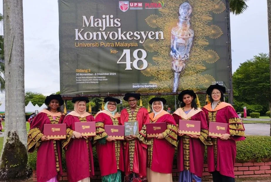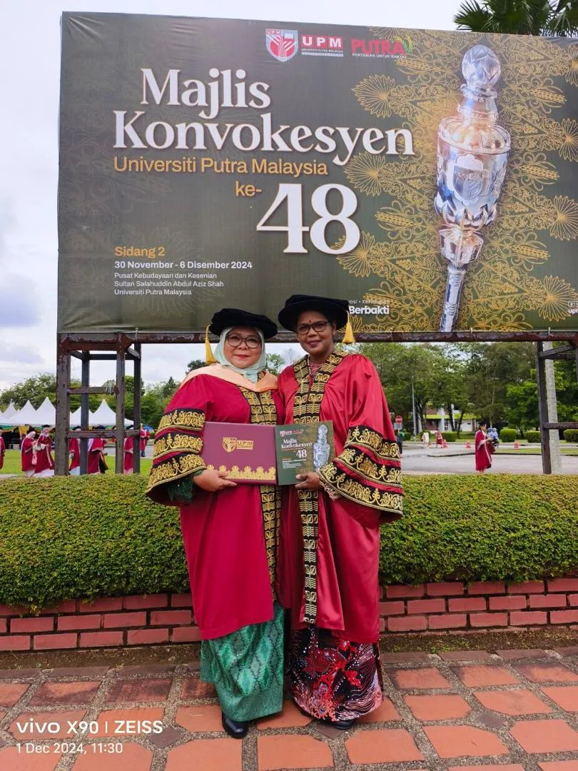 At the 48th convocation ceremony of Universiti Putra Malaysia (UPM) held on December 2, six students, including five local students—Pavitira Nagaraju, Usha Nagasundram, Nur Maisarah Roslan, Amirra Shazreena Aminul Razin, and Shobehah Abdul Karim—along with an international student, Sun Aina, were awarded their PhD degrees. These students were under the supervision of Prof. Dr. Vijayaletchumy Subramaniam from the Department of Malay Language.