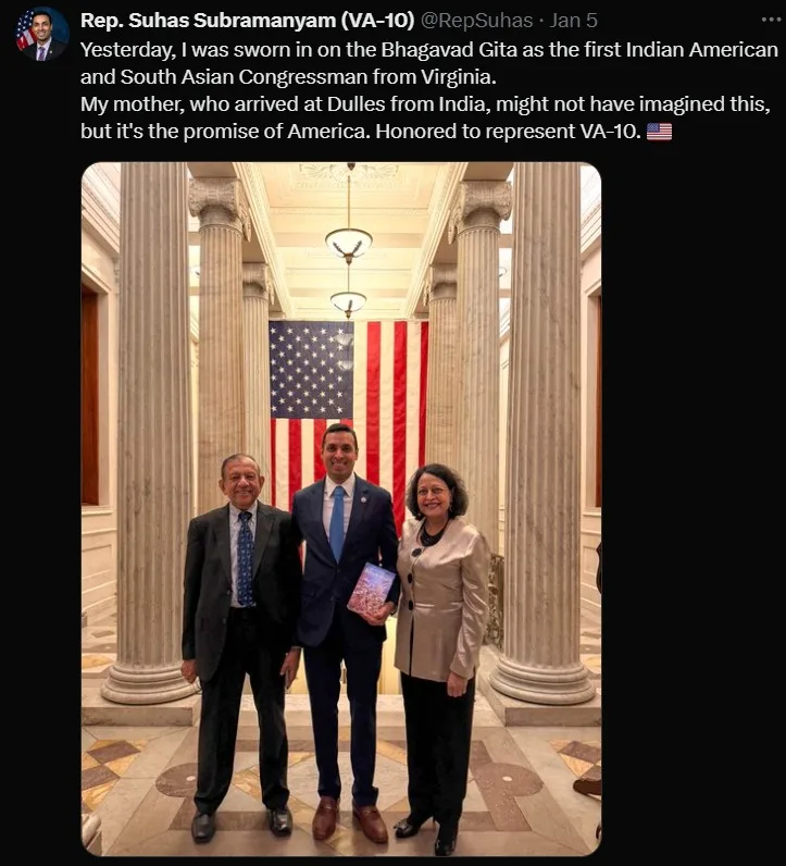 In a landmark moment for the Indian-American community, Suhas Subramanyam, the first Indian-American Congressman from the East Coast, took his oath of office on the sacred Hindu scripture, the Bhagavad Gita. This historic event reflects the growing influence and representation of Indian-Americans and the Hindu community in U.S. politics.
