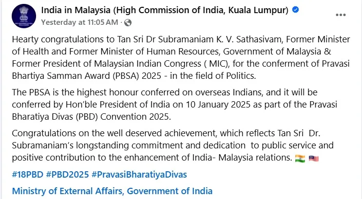 Former MIC president and Malaysian Health Minister, Tan Sri Dr. S. Subramaniam, will be awarded the esteemed Pravasi Bharatiya Samman Award (PBSA) 2025, today. This honor, presented by the Indian government, recognizes his exceptional contributions to public service and India-Malaysia relations.