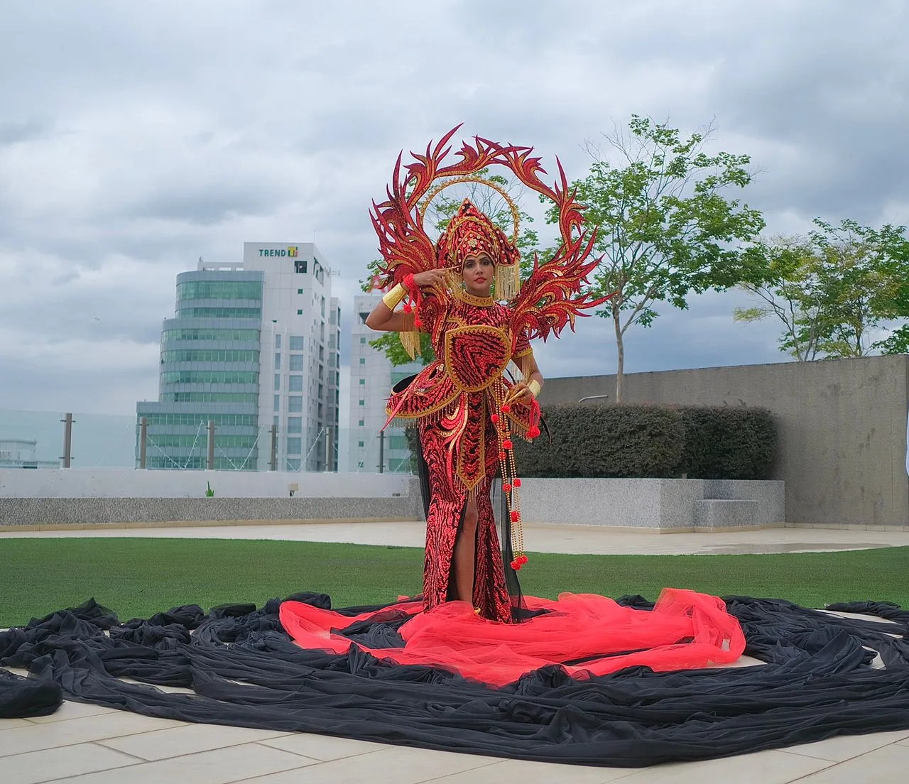 The red represents unity, love and determination, reflecting the strong bonds among Malaysians. Meanwhile, the black signifies sophistication, power and grace, qualities that epitomize the Malaysian woman. The dazzling costume was designed by Saran Anak Lagong from Sarawak, embodies Malaysia’s cultural pride and its bold, progressive identity on the global stage.