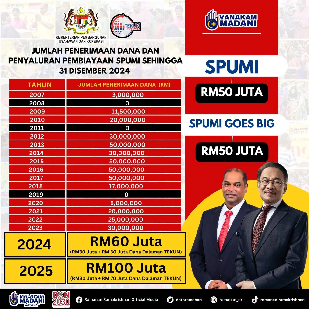 SPUMI has an impressive track record, having supported 26,804 Indian entrepreneurs with a total of RM500 million in financing since its inception in 2007. In 2024, a total of RM58.9 million was allocated to support 2,408 Indian entrepreneurs through SPUMI. Additionally, SPUMI Goes Big, launched in April 2024, provided RM12.6 million in funding to 287 entrepreneurs.