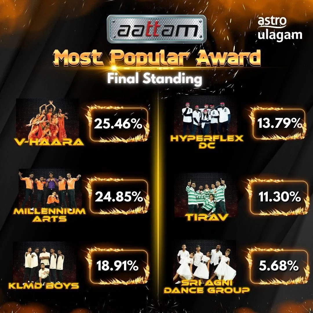 Hyperflex DC triumphed as the ultimate champion of Astro’s renowned dance competition, Aattam, claiming the grand prize of RM50,000 after a thrilling showdown against KLMD Boys in the third and final round. Meanwhile, Millennium Arts secured third place, earning the second runner-up spot, while V-Haara, finishing fourth, was honoured with the AATTAM Most Popular Award, receiving an impressive 25.46% of the public vote.