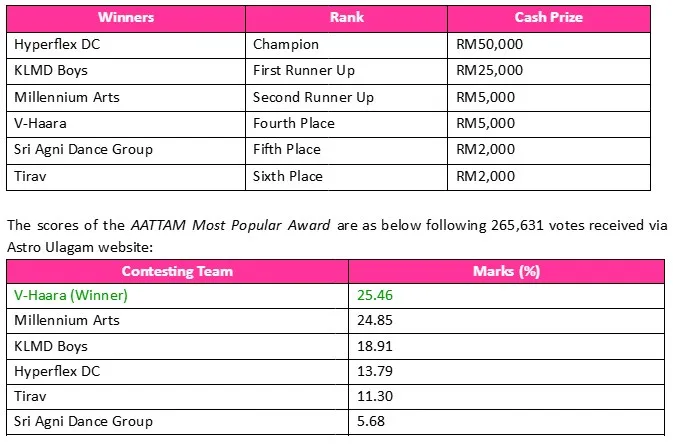 Prem Anand, Vice President, Indian Customer Business, Astro, said, “We are pleased to reboot Aattam after 13 years, and for the very first time we held our signature dance competition LIVE at Indera Mulia Stadium in Ipoh, Perak. Our heartfelt congratulations to Hyperflex DC for winning the coveted title of champion, as well as all the other winners for their remarkable achievements in the grand finale despite the twists and turns. We are taking pride in creating a historic success of more than 2000 fans who watched it LIVE while concurrently enjoyed by Malaysian households through Astro. We look forward to doing more of these types of shows that groom the local talents.”