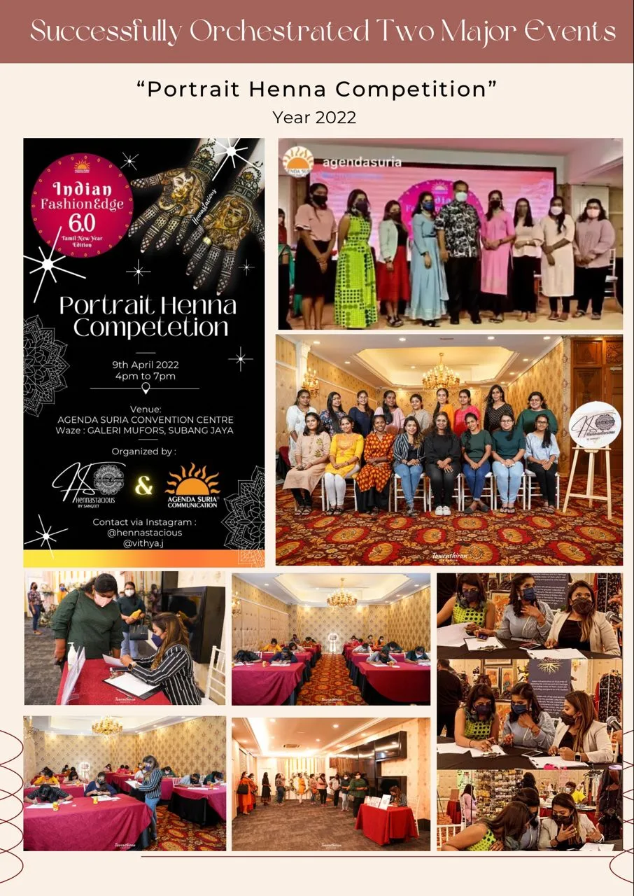 In 2022, Sanggetha made history as the first in Malaysia to organize a Portrait Henna Competition, an exciting and innovative event that brought together talented henna artists from across the country. This groundbreaking competition, supported by Agenda Suria Communications, showcased the artistry and skill involved in creating intricate, lifelike portraits using henna. The event not only celebrated the creativity of henna artists but also helped elevate the art form within the Malaysian cultural landscape. It was a significant milestone in her journey to expand the recognition of henna artistry on a larger scale.