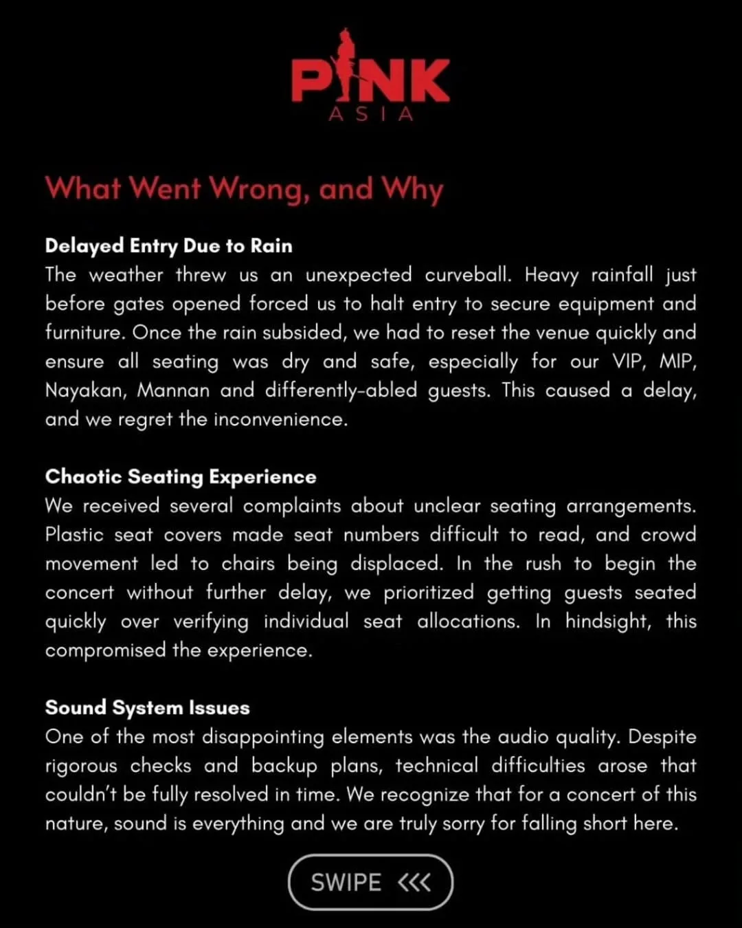The agency assured the audience that they gave their all to deliver the best possible concert experience, and they are committed to using this experience to improve and prepare for even bigger and better events in the future.