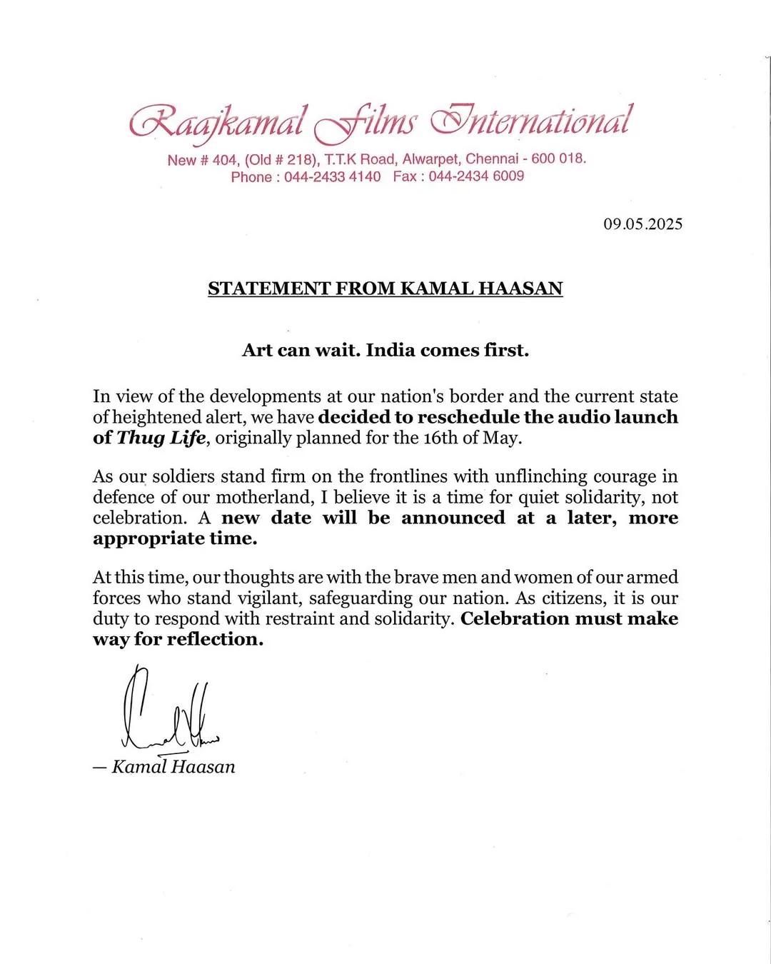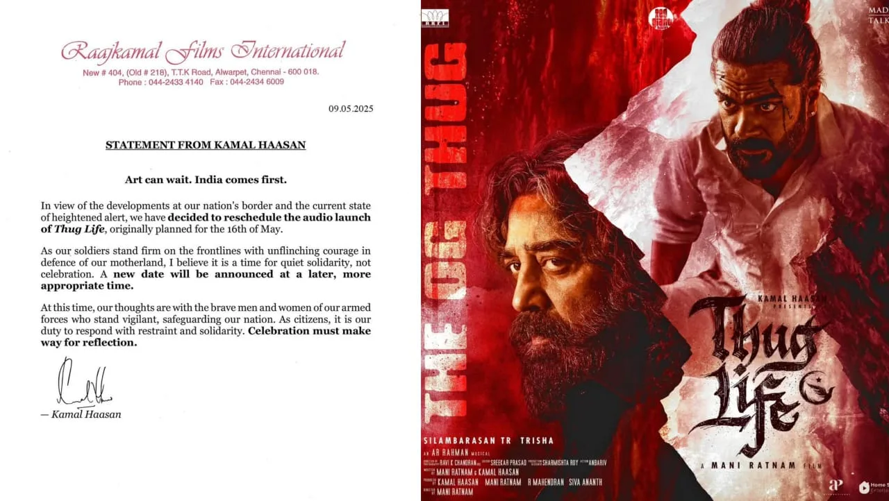 Kamal Haasan and Raaj Kamal Films International issued an official statement saying, “Art can wait — the nation comes first. Considering the current situation at the country’s borders and the heightened state of alert, we have made the decision to postpone the audio launch of Thug Life, which was initially scheduled for May 16.”