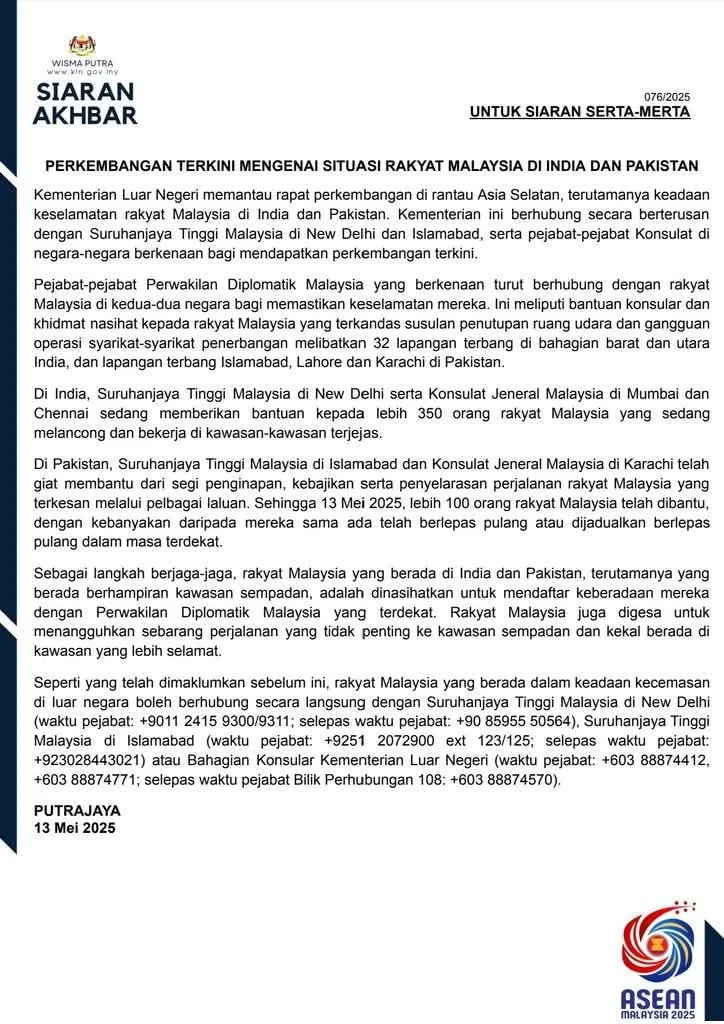 As tensions between India and Pakistan show signs of de-escalation with the recent ceasefire agreement, Malaysian authorities continue to prioritize the safety and well-being of their citizens in both countries. While efforts are underway to assist those affected and facilitate the return of Malaysians from Pakistan, the situation remains fluid. Wisma Putra urges all Malaysians in the region to stay informed, remain in contact with local diplomatic missions, and exercise caution as developments unfold.