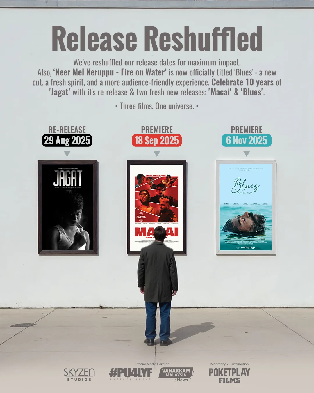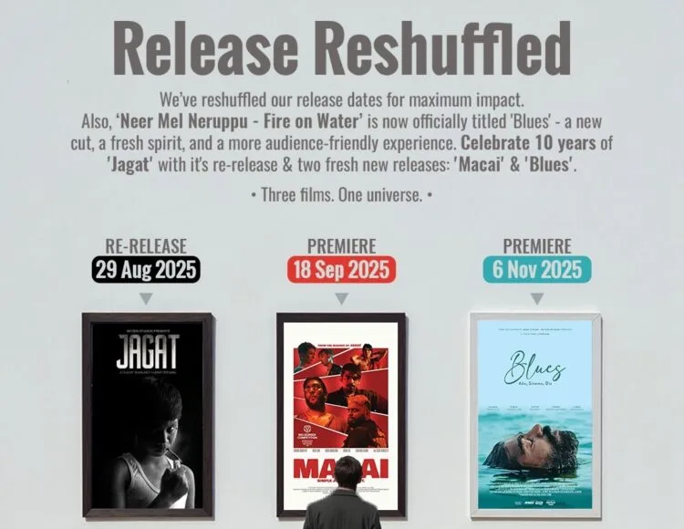 The updated release schedule is as follows: Jagat will be re-released on 29 August 2025, followed by the premiere of Macai on 18 September 2025, and finally, Blues—formerly titled Neer Mel Neruppu—will be released on 6 November 2025.