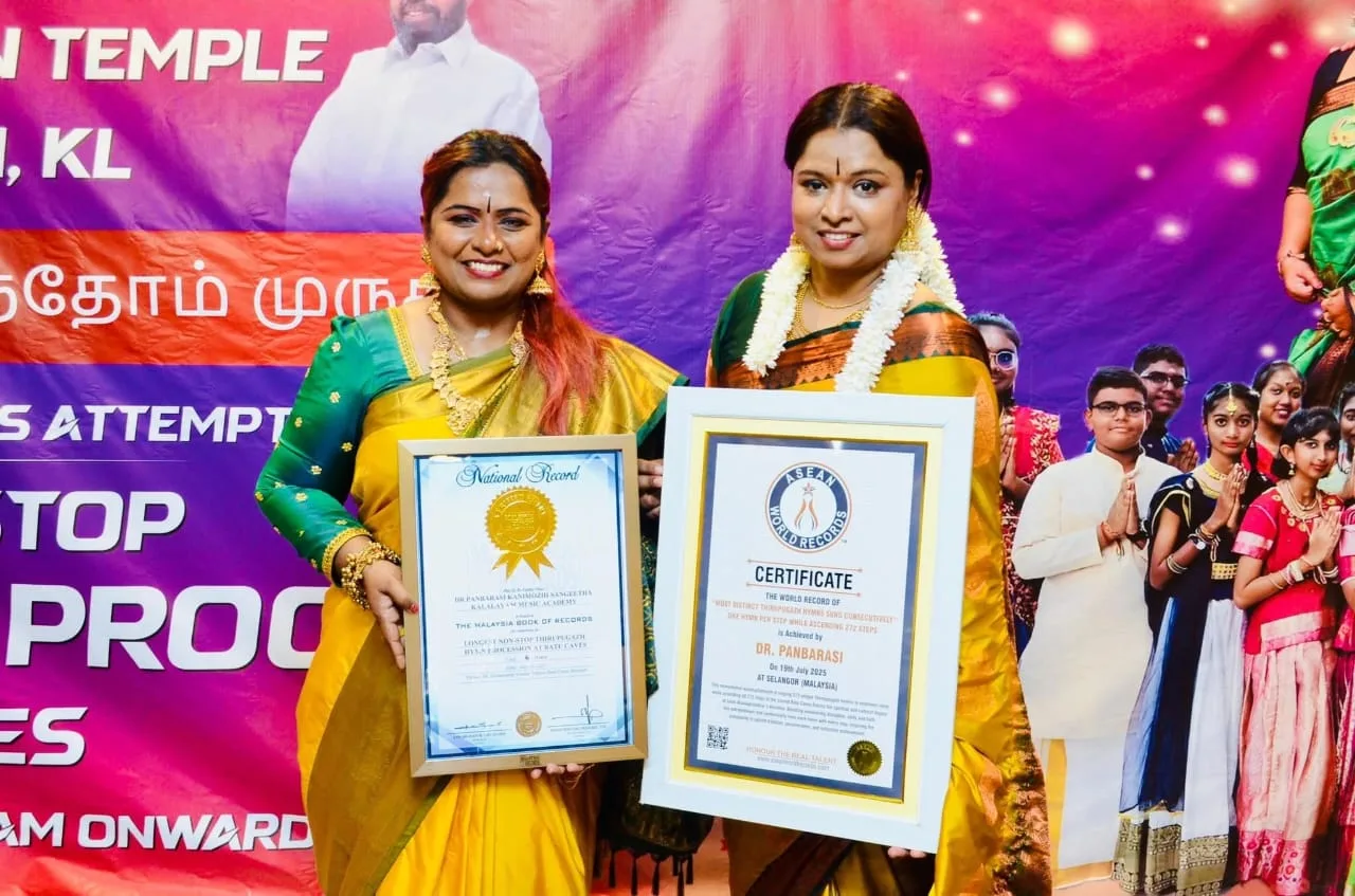 Dr. Panbarasi’s Sangeetha Kalalayam Music Academy from Perak achieved a remarkable milestone last weekend. On July 19, the academy earned a place in the Malaysia Book of Records for organizing the longest non-stop Thiruppugazh hymn procession, marking a proud moment for both the institution and the Indian classical music community in Malaysia.
