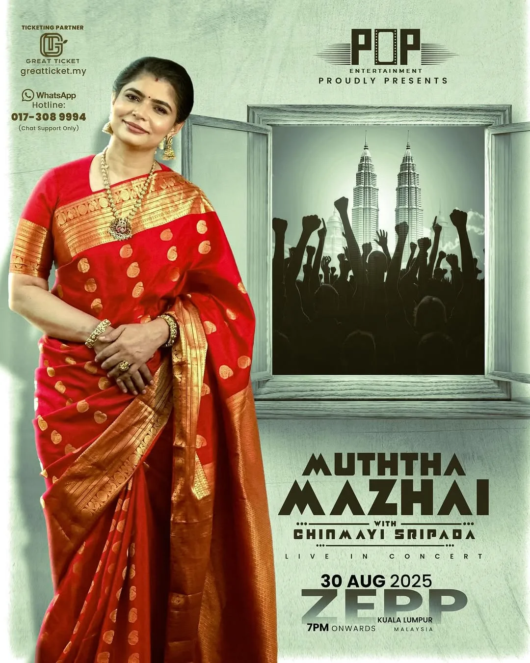 Pop Entertainment proudly presents a live concert by the acclaimed playback singer Chinmayi Sripada. Known for her soulful voice and memorable performances across Tamil, Telugu, and Hindi cinema, Chinmayi will enchant audiences with an unforgettable evening of music. The concert is set to take place on 30 August 2025 at Zepp Kuala Lumpur.