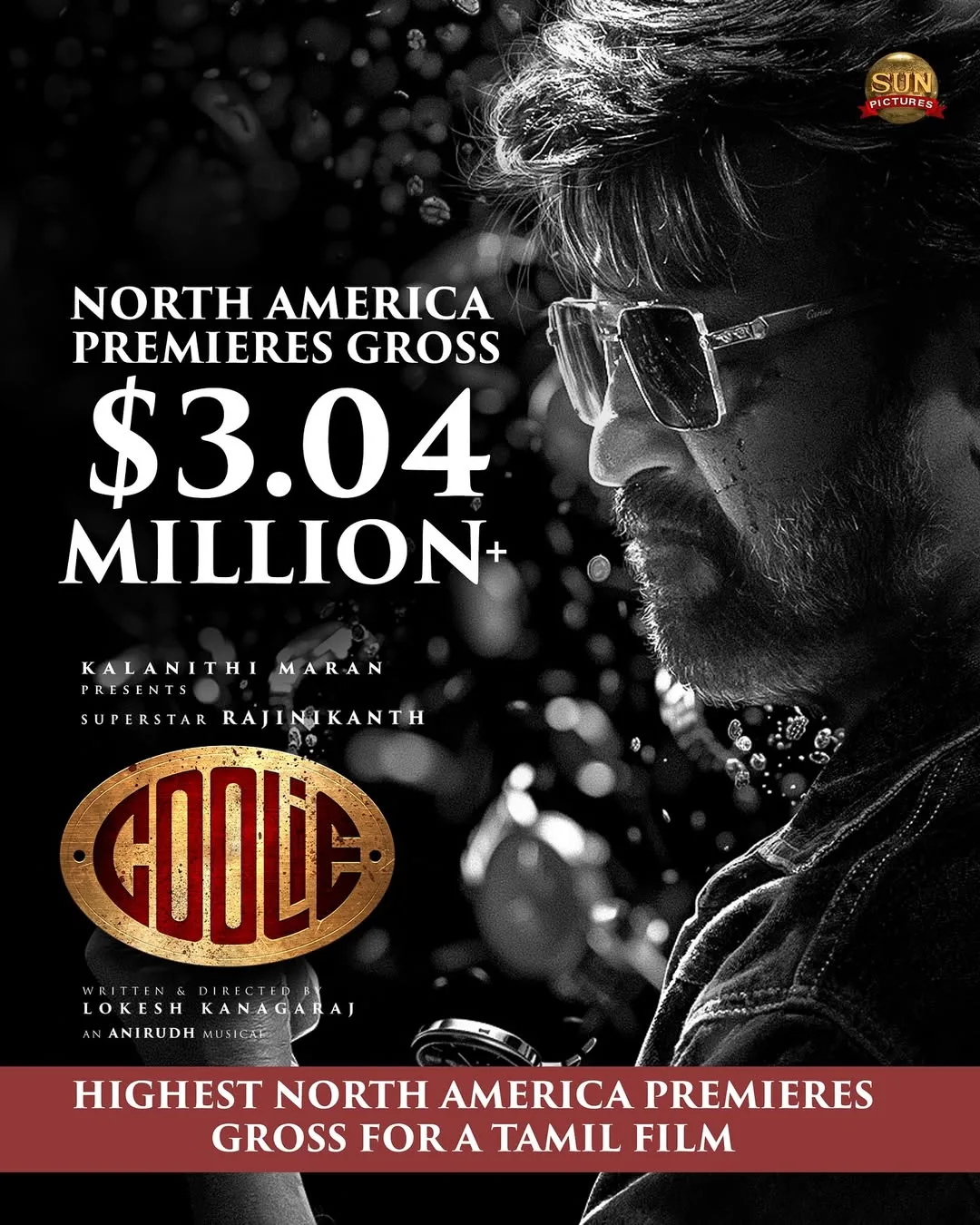 Tamil cinema’s latest blockbuster, Coolie, has stormed the North American box office, grossing an impressive $3.04 million on its opening day, according to procedure Kalanithi Maran’s Sun Pictures. The milestone cements Coolie as the highest-grossing Tamil film in North America for premiere day collections.