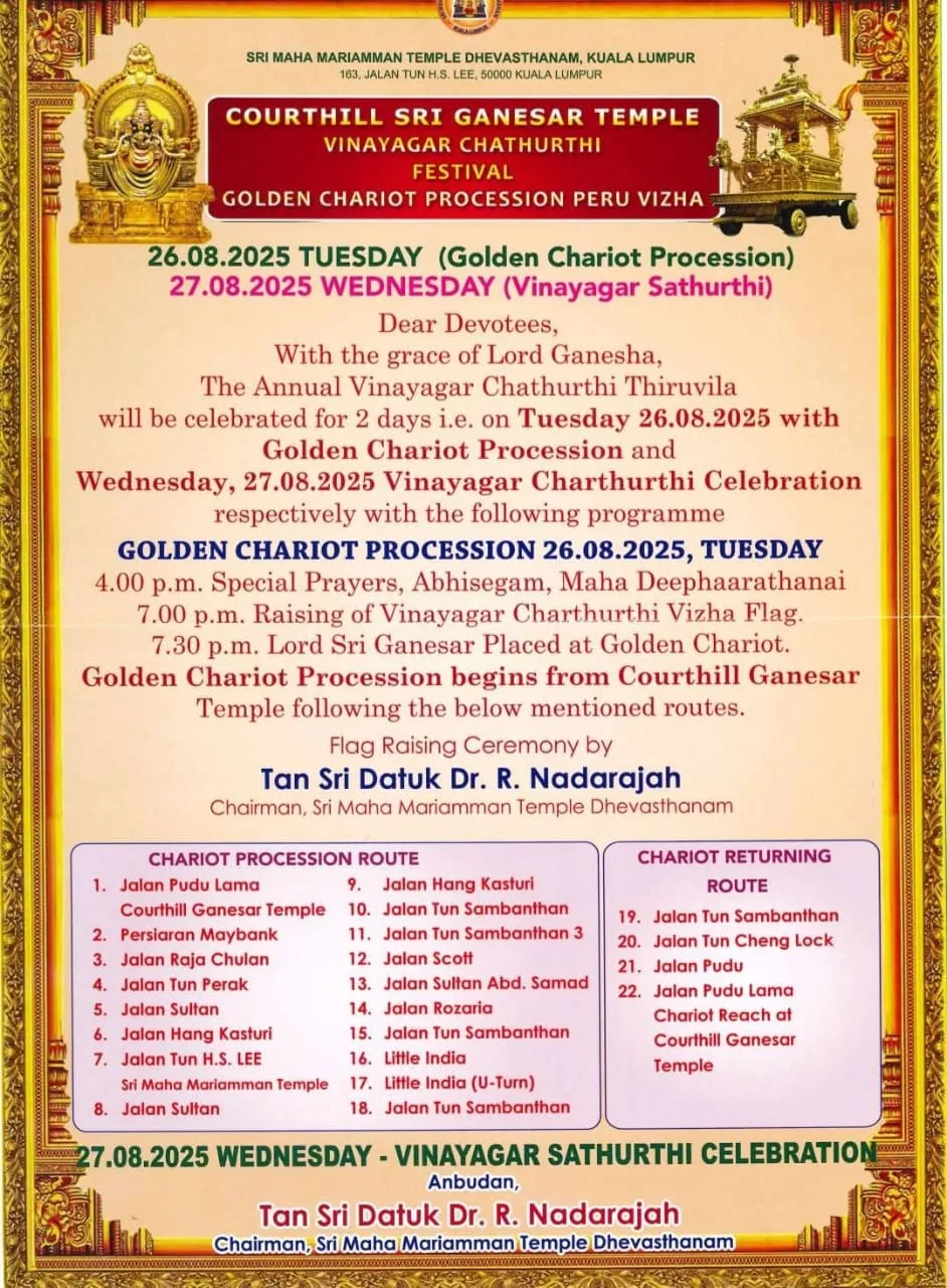 The Golden Chariot Procession will take place on Tuesday, 26th August 2025. The evening will begin at 4.00 p.m. with special prayers, Abhisegam, and Maha Deeparathanai. At 7.00 p.m., the Vinayagar Chathurthi flag raising ceremony will be conducted by Tan Sri Datuk Dr. R. Nadarajah, Chairman of the Sri Maha Mariamman Temple Dhevasthanam. Following this, at 7.30 p.m., Lord Sri Ganesar will be ceremoniously placed on the Golden Chariot, marking the commencement of the grand Golden Chariot Procession, which will begin from the Court Hill Sri Ganesar Temple and proceed along the designated routes.