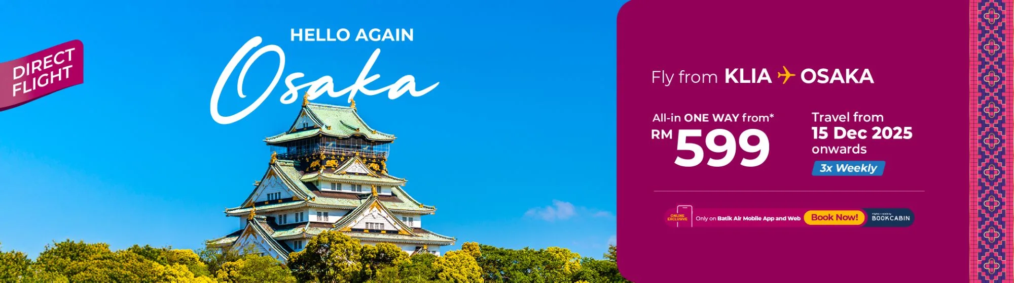 Batik Air has announced the return of its direct service from Kuala Lumpur International (KLIA) to Osaka Kansai International Airport (KIX), beginning 15th December 2025, marking a renewed commitment to strengthening connectivity between Malaysia and Japan.