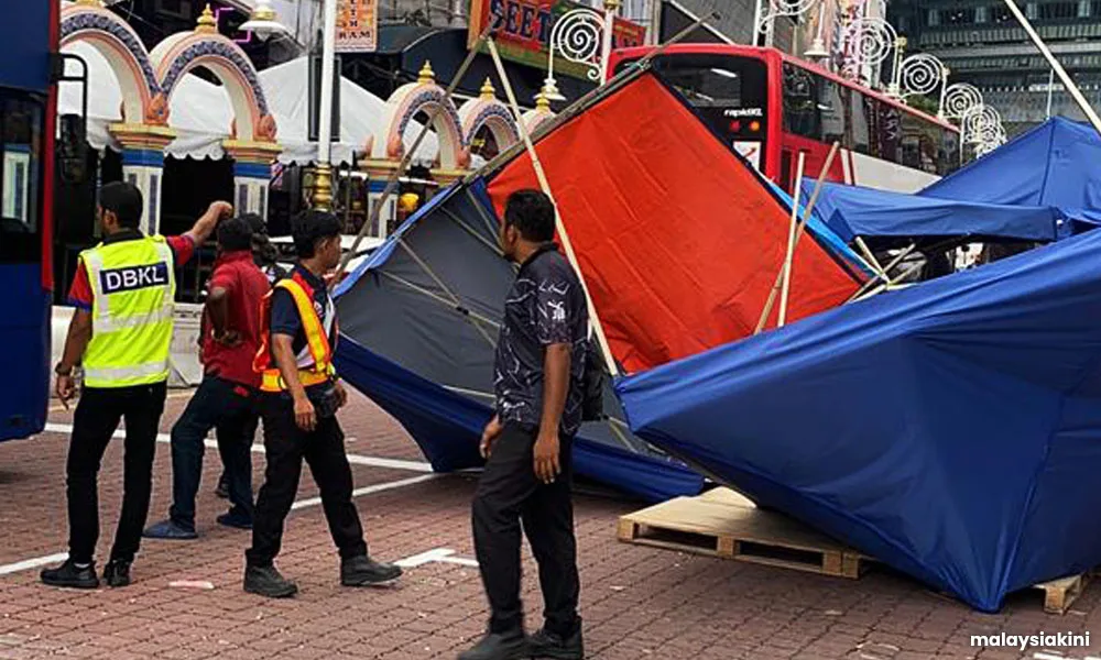 In an unfortunate turn of events yesterday, strong winds and heavy rain caused all the tents at the Brickfields Deepavali Bazaar to collapse, causing significant inconvenience to the sellers.