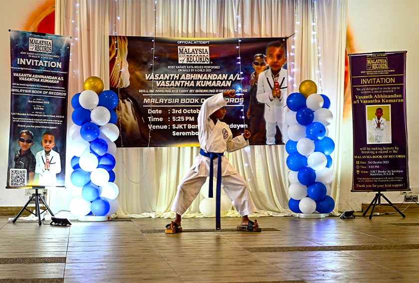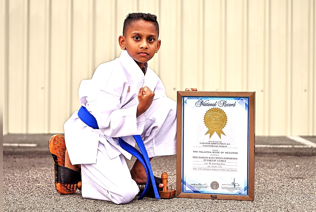 In a remarkable display of discipline, creativity, and courage, eight-year-old V. Vasanth Abhinandan has made history by earning a spot in the Malaysia Book of Records (MBR) for performing Karate Kata movements on nails for 10 minutes, a feat never before attempted by a child in the country.