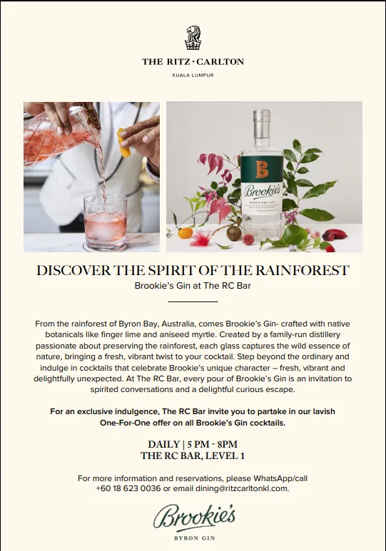 Cocktail enthusiasts can celebrate the season with Brookie’s Gin Cocktails at the RC Bar, located in The Ritz-Carlton, Kuala Lumpur. This limited-time offering includes a creative selection of gin-based drinks, perfect for anyone looking to unwind in style at one of the city’s most sophisticated bars.