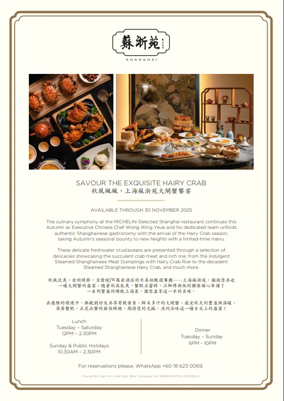 Seafood enthusiasts are in for a treat as Shanghai, a MICHELIN-Selected restaurant at JW Marriott Kuala Lumpur, unveils its highly anticipated Season Hairy Crab Menu. Known for its delicate flavors and top-quality ingredients, the hairy crab is a must-try for food lovers seeking a refined culinary experience this season.