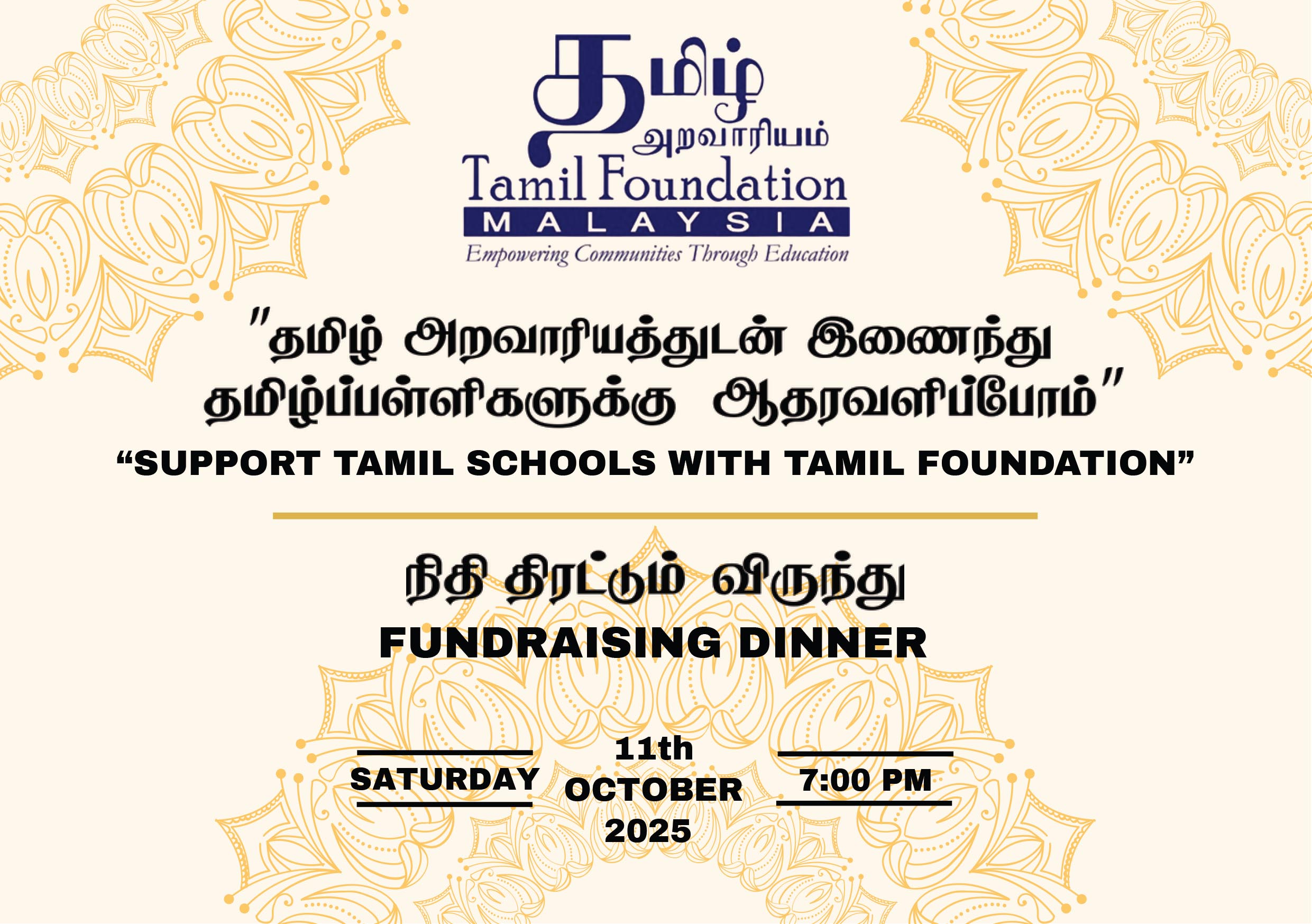 The funds raised during this event will be allocated to the Foundation’s educational initiatives. These initiatives include contributions from parents for student welfare, leadership and administrative training for Tamil school principals, and improvements in Tamil language education. The Tamil Foundation is hopeful that these constructive programs will help preserve and enhance Tamil schools and Tamil education.