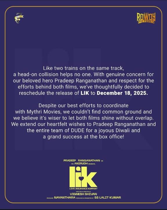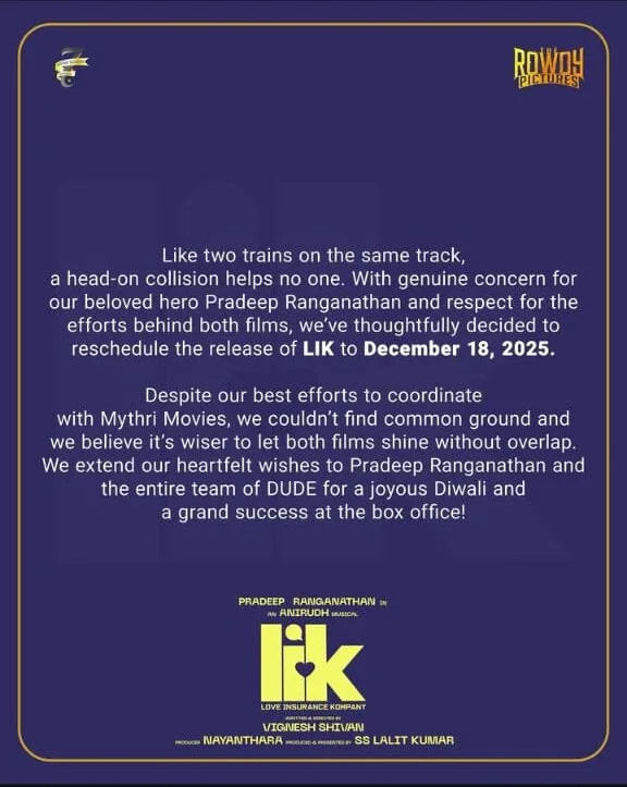 In a social media press release, 7 Screen Studio, the producers of Love Insurance Kompany, announced that the release has been postponed to avoid clashing with Dude. Since both films feature Pradeep Ranganathan, releasing them on the same day could negatively impact box office collections.