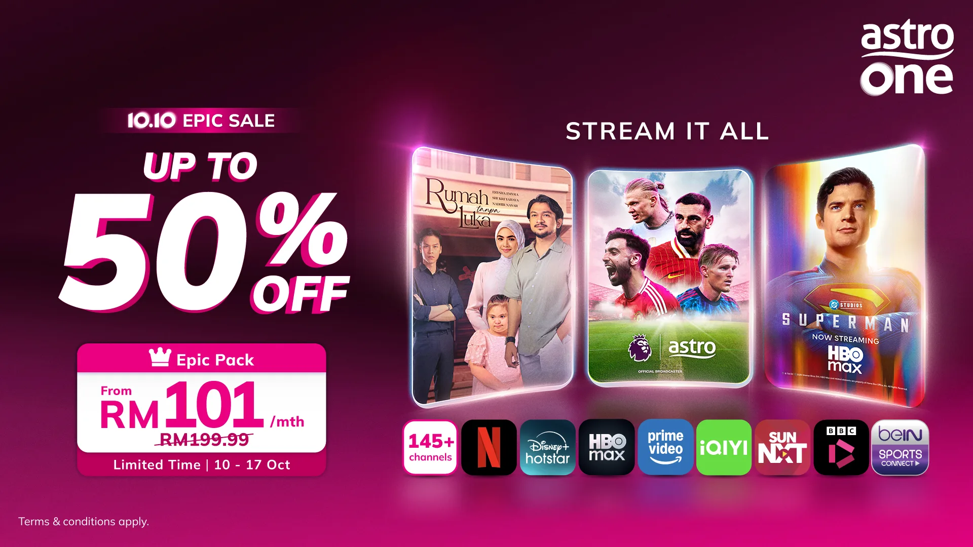 From October 10 to October 17, 2025, new customers who sign up for the Astro One Epic Pack via https://astro.com.my/ can take advantage of an exclusive rate of RM101 per month for 24 months (regular price RM199.99/month).