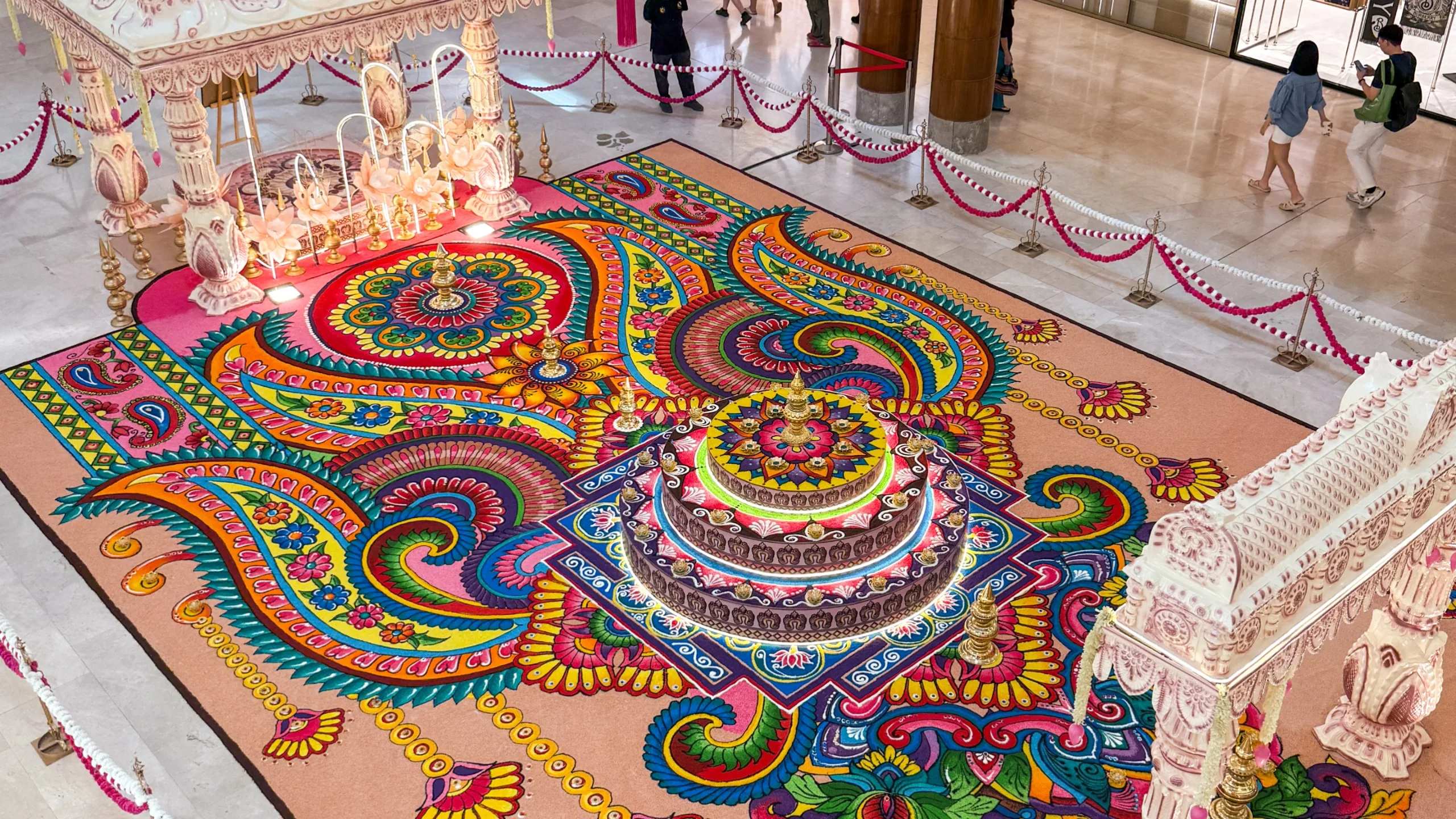 At the heart of the celebration lies a stunning kolam design, a hallmark of Deepavali, inspired by the intricate beauty of Mughal domes, carved pillars, ornate arches, and sacred architectural motifs symbolizing protection and prosperity. This year’s kolam goes beyond decoration, it tells a story. Drawing from the graceful poses of bharatanatyam dancers and the flow of classical Indian music, the design reflects how movement, art, and devotion intertwined to celebrate light conquering darkness.