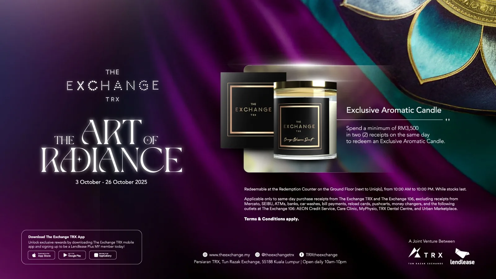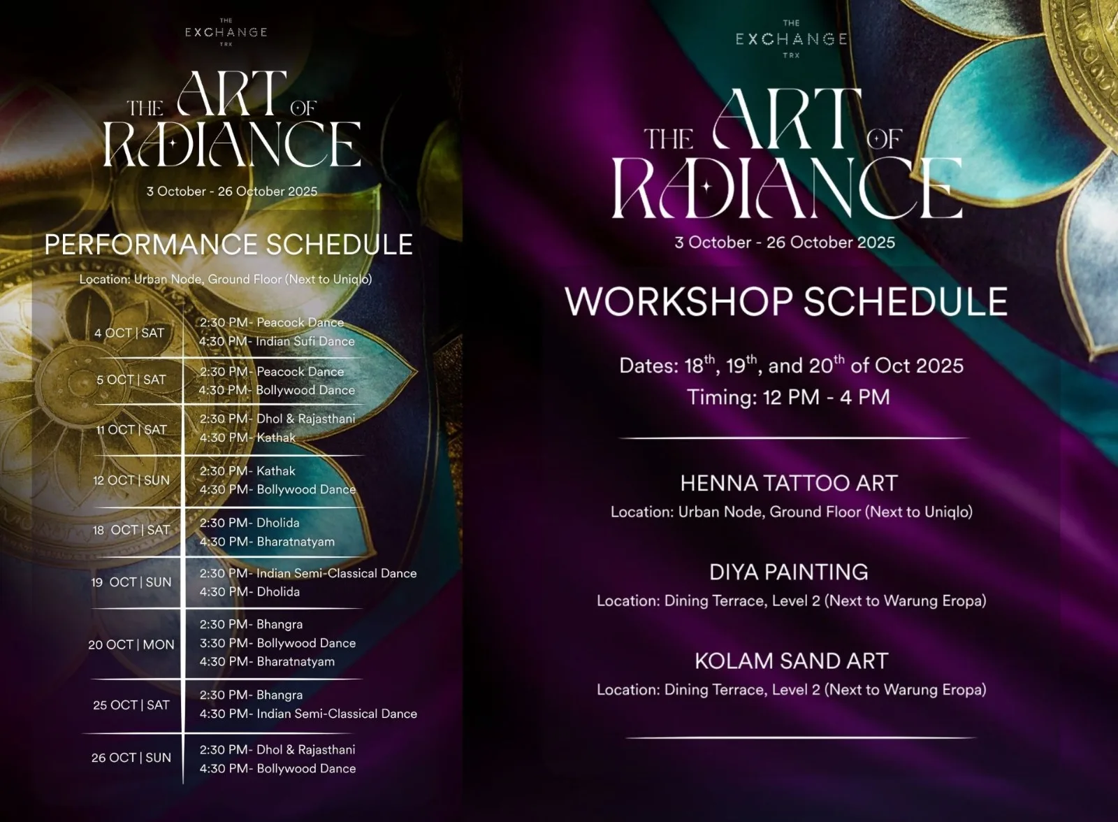 The Art of Radiance takes place from 3rd–26th October 2025 at The Exchange TRX. Enjoy the lights, explore the culture, and celebrate the festive spirit. Follow @theexchangetrx for updates on shows, workshops, and shopping exclusives.