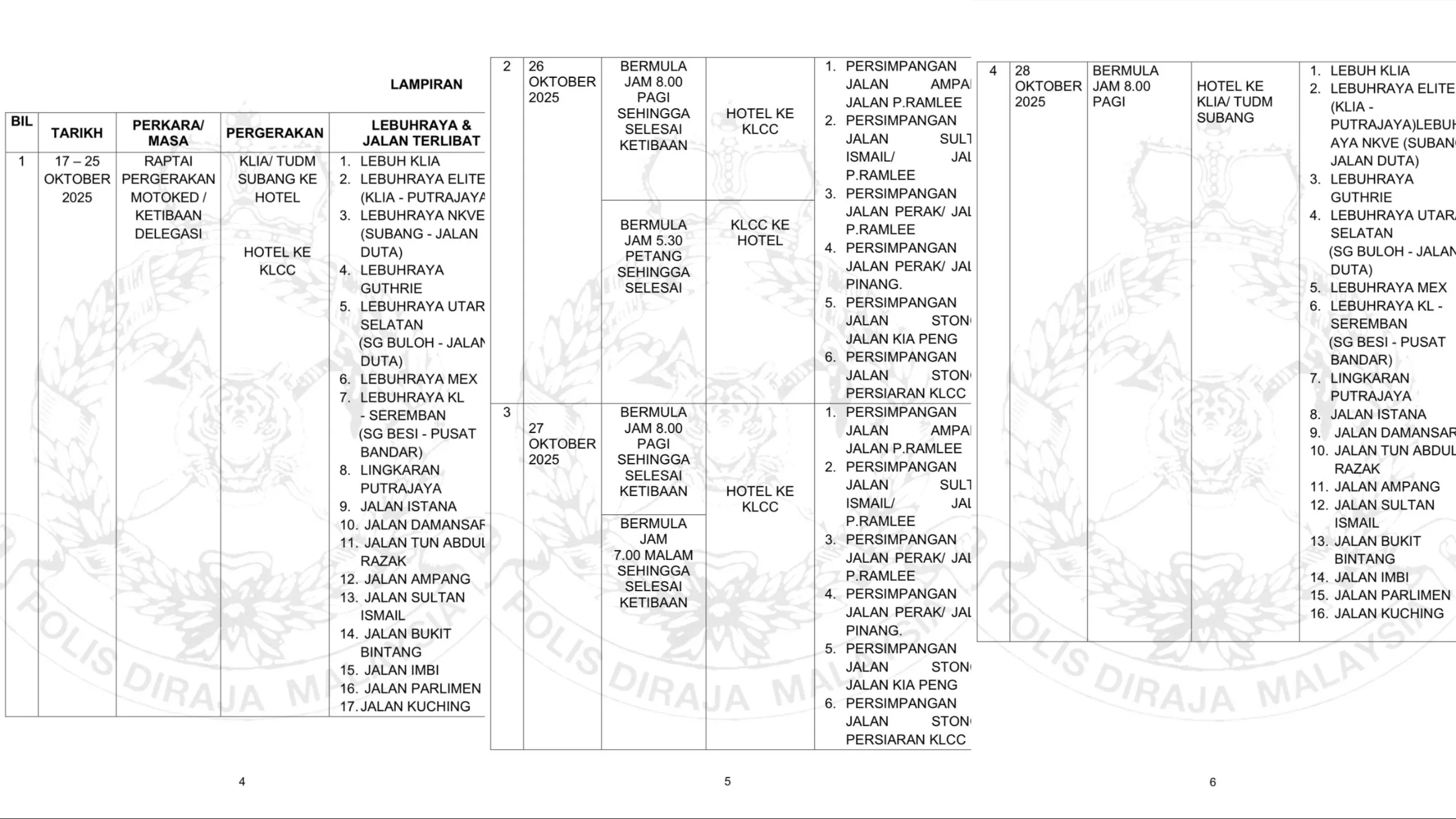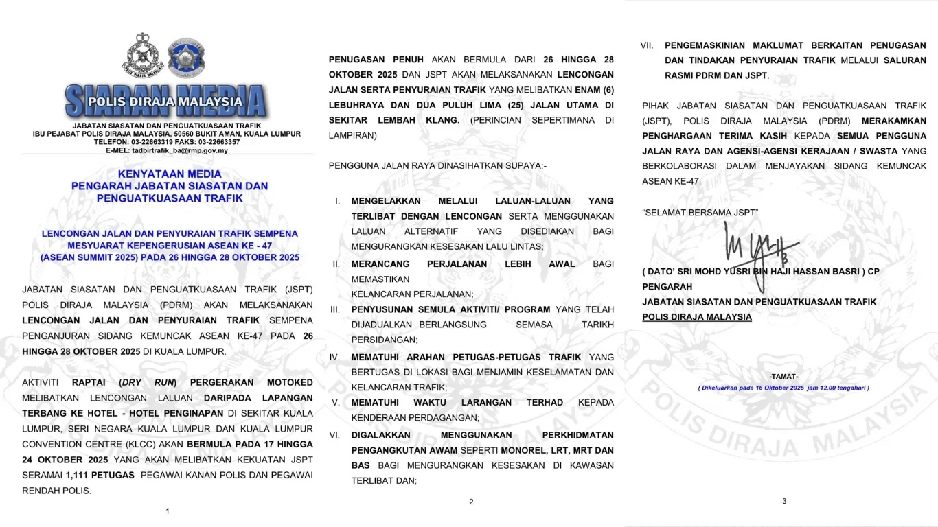 Cooperation from all parties is urged in order to ensure the safety and smooth flow of traffic over three day event. Updates on the road closures will be released time to time and the public may check the official ASEAN 2025 portal or the official ASEANmy Facebook page for the latest information.