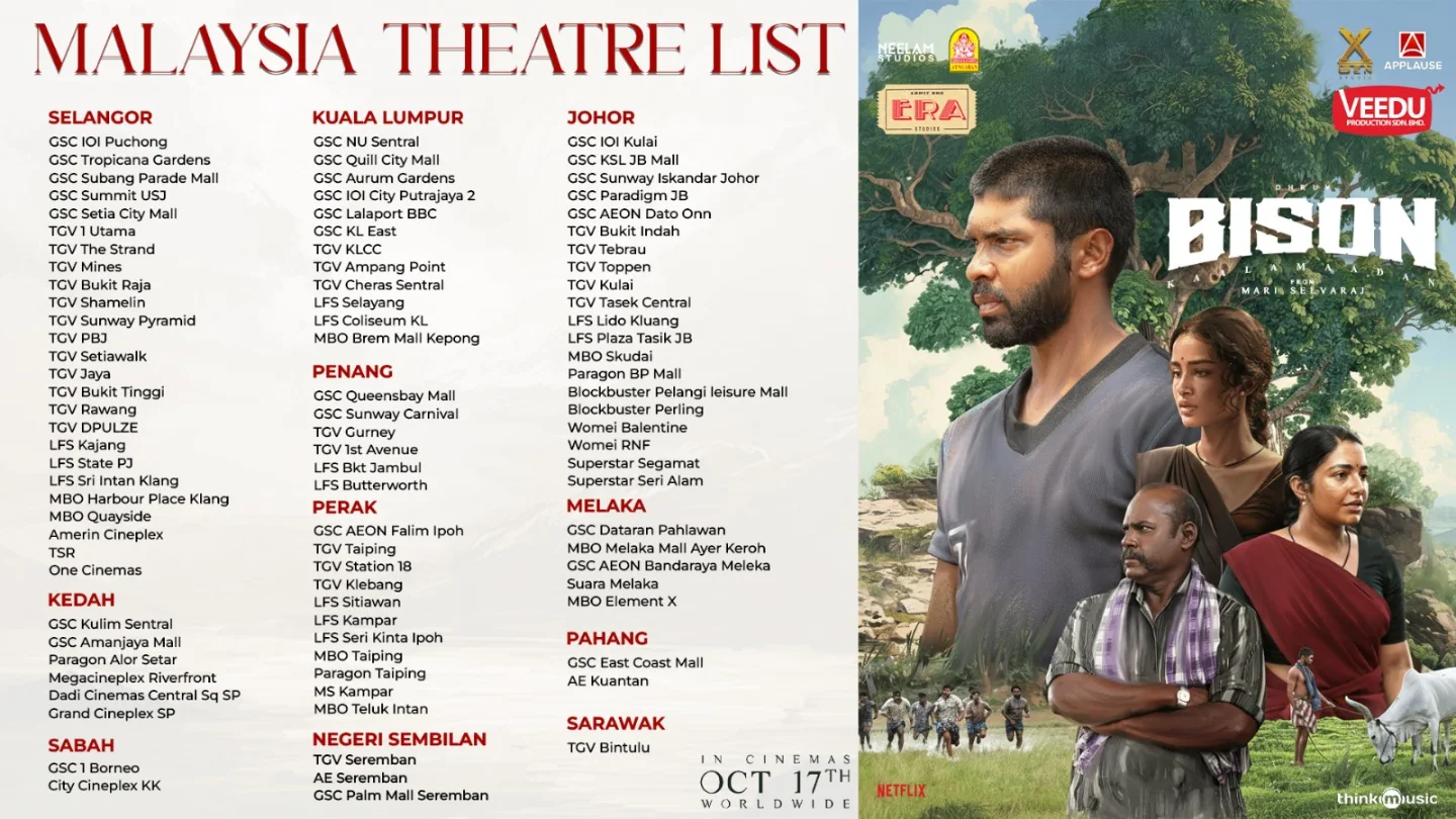 From director Mari Selvaraj, Bison is a sport drama enveloped in social themes. Dhruv Vikram leads the cast as a kabaddi player, with Anupama Parameswaran, Rajisha Vijayan, Pasupathy, Lal among the ensemble. Expect emotional depth, conflict, and a film that resonates beyond the sports arena. The film will be distributed in Malaysia by Era Studios and Veedu Production.