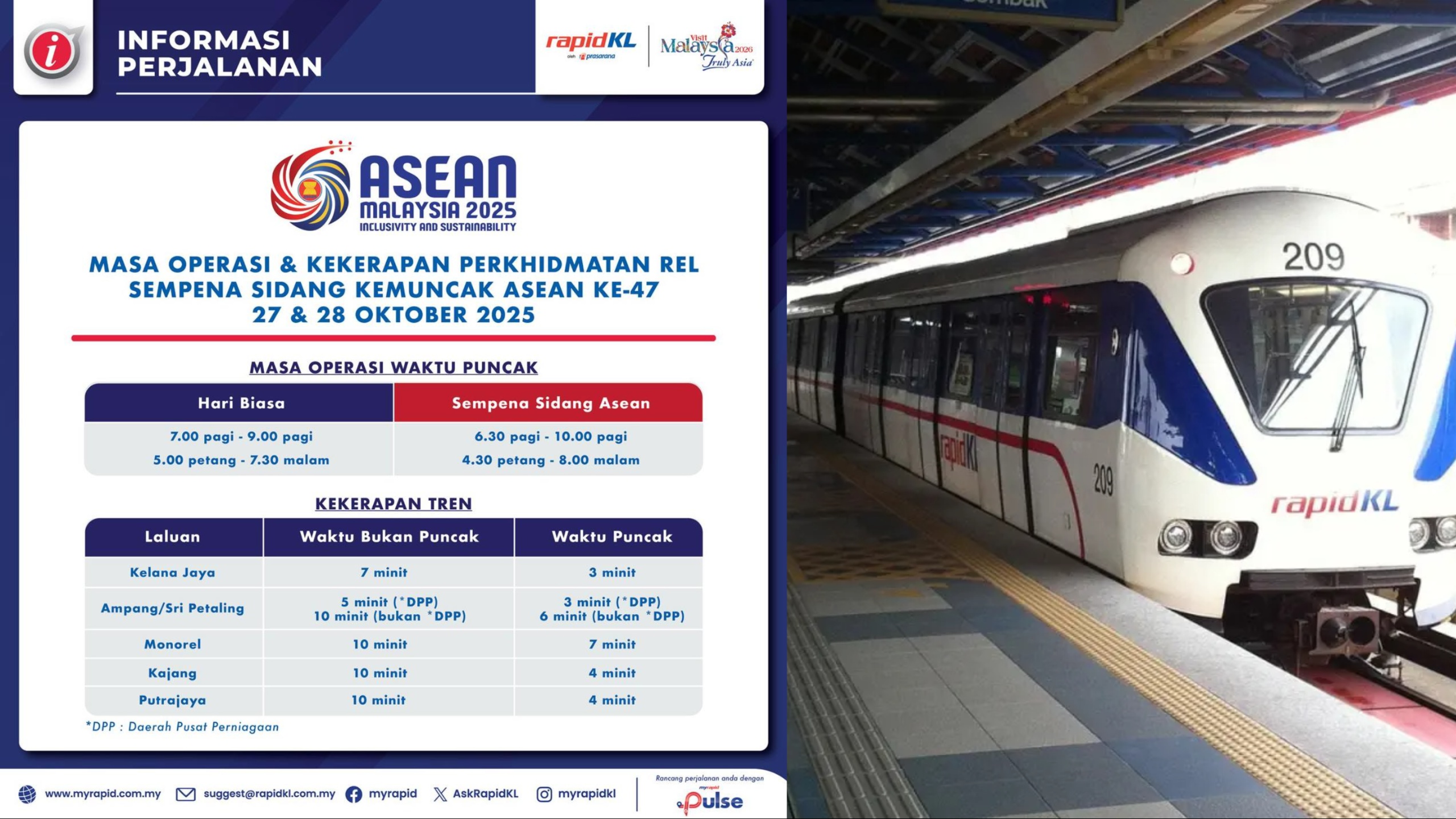 According to Prasarana Malaysia Berhad, the adjustments aim to ensure smooth and efficient travel for summit delegates, city commuters, and visitors throughout the event period. The extended operating hours will run from 6:30 a.m. to 10:00 a.m. during the morning peak, and 4:30 p.m. to 8:00 p.m. during the evening peak.