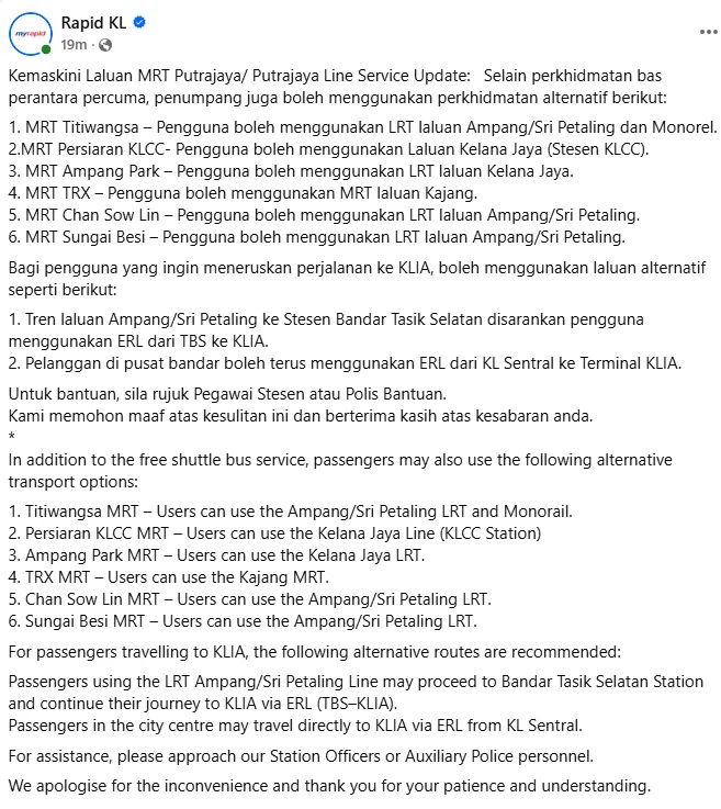 Free shuttle feeder buses have been deployed to assist affected passengers, while auxiliary police and station staff are on duty at platforms, lobbies, and bus stops to help manage the situation.