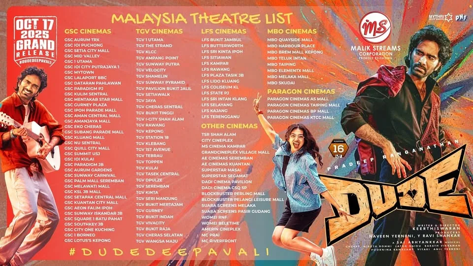 Dude released worldwide on 17 October 2025, distributed in Malaysia by Malik Streams Corporation. Grab your tickets, bring your friends and family, and experience this must-watch ride of love, chaos, and emotions!