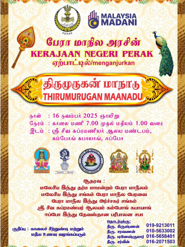 A. Sivanesan, a member of the Perak State Executive Council, announced that the Thirumurugar Maanadu will take place for the first time, supported and organized by the Perak State Government. This event is scheduled for Sunday, November 16, 2025, at the Sri Siva Subramaniar Temple Hall located in Kampung Kepayang, Gopeng. The conference will run from 10:00 AM to 1:00 PM.