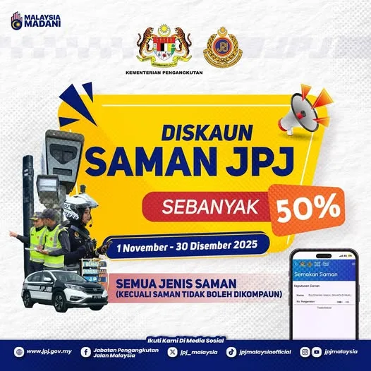 To encourage payment, the ministry has introduced a 50% discount on all JPJ summonses from 1 November to 31 December 2025. Loke urged motorists to take advantage of this opportunity to settle their dues and avoid potential penalties.
